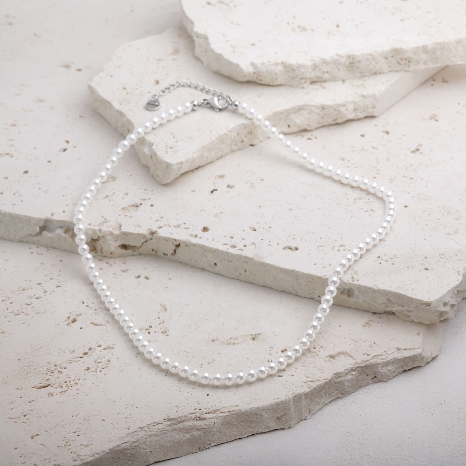 Questa elegante collana di perle, realizzata in pregiato acciaio chirurgico 316L, unisce un design senza tempo a una qualità destinata a durare. Le perle sintetiche perfettamente levigate, con diametro di 4 mm, sono disponibili in raffinato argento o in caldo oro scintillante, regalando un tocco glamour a qualsiasi outfit.