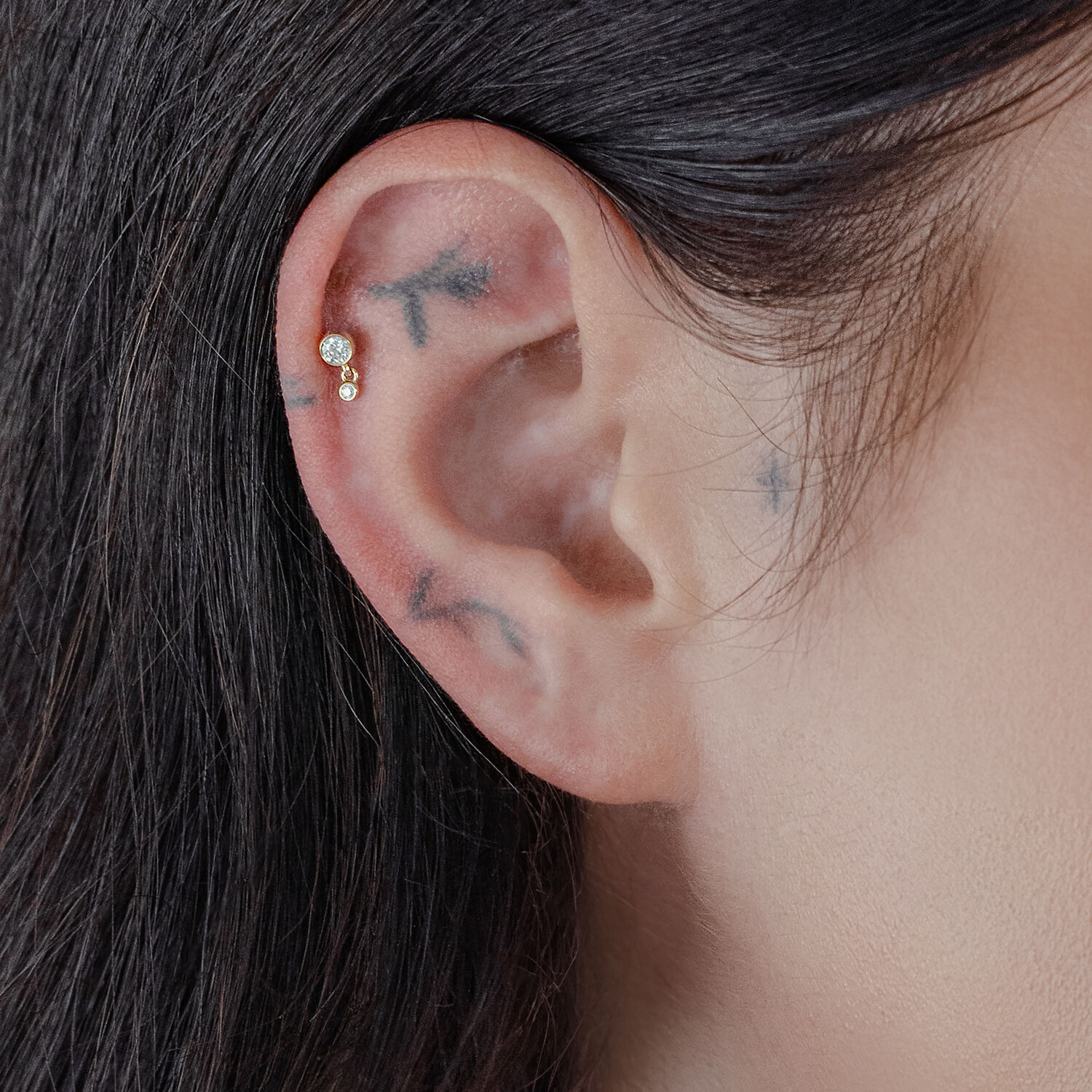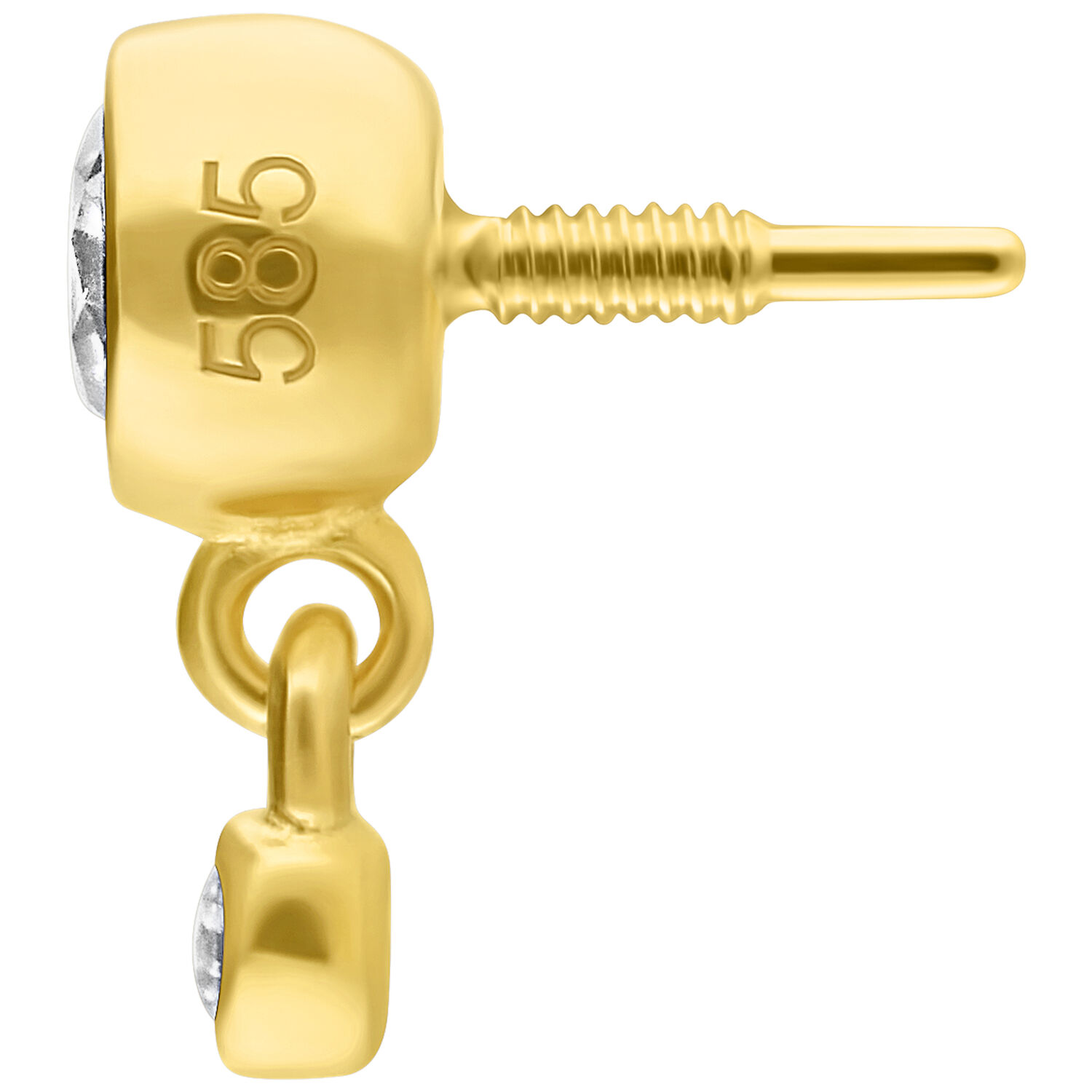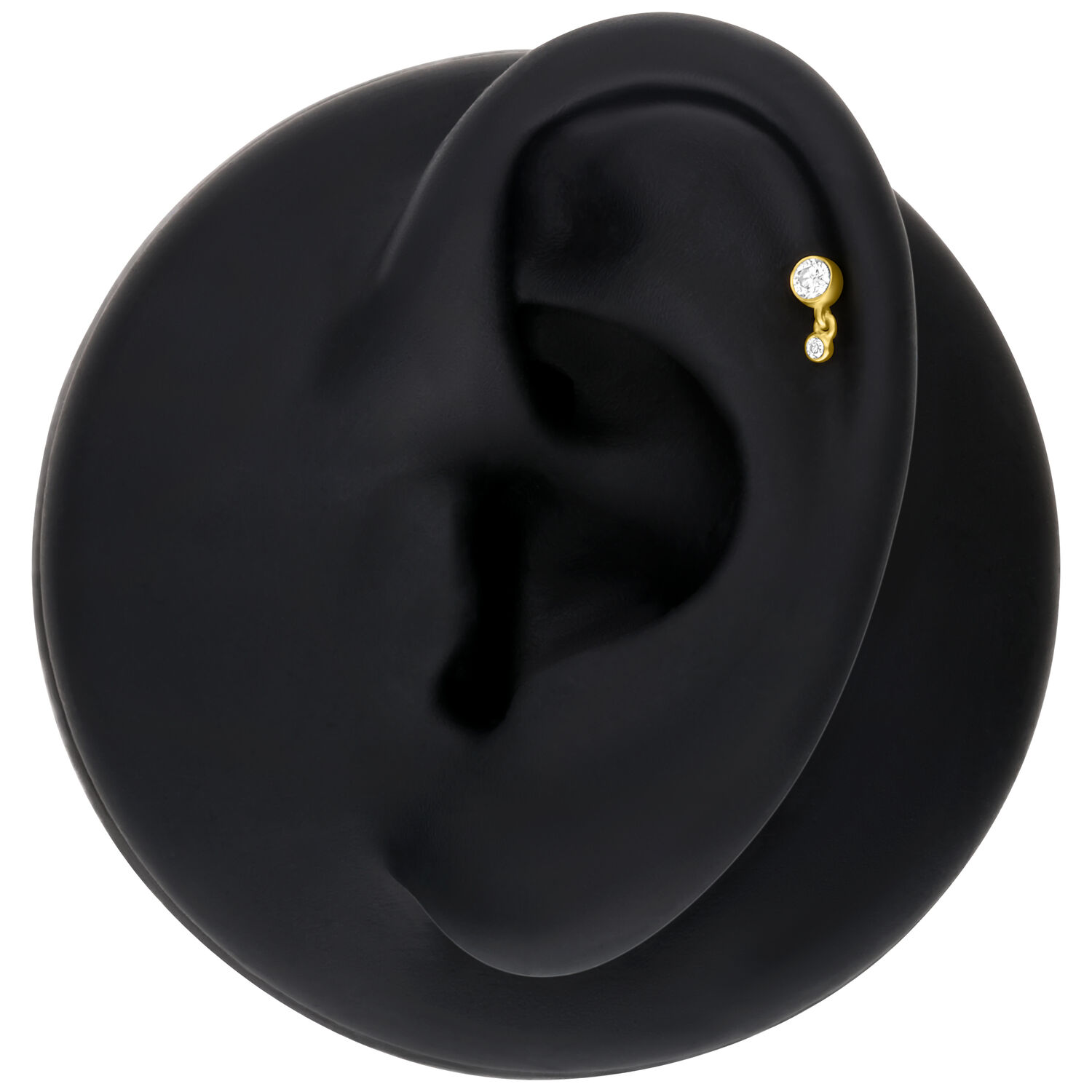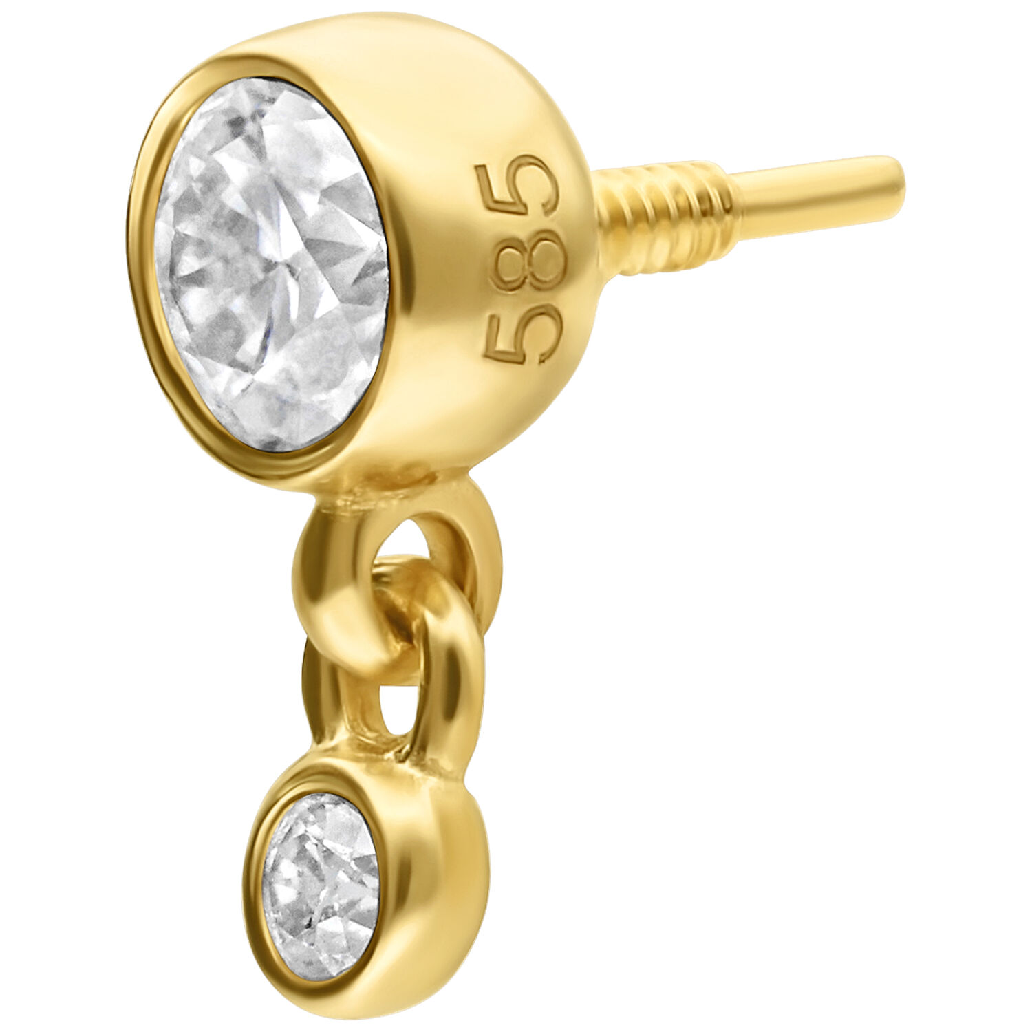Il terminale Doppio Cristallo della collezione Wildcat conquista con due scintillanti zirconi di alta qualità in dimensioni diverse: la pietra superiore misura 3.1 mm, mentre quella inferiore, mobile e pendente, è di 1.2 mm, creando un delicato movimento a ogni passo. Realizzato in oro giallo 14 carati (585) lucidato a specchio e progettato appositamente per il Perfect Fit Labret (14K), questo raffinato gioiello combina brillantezza e massimo comfort.