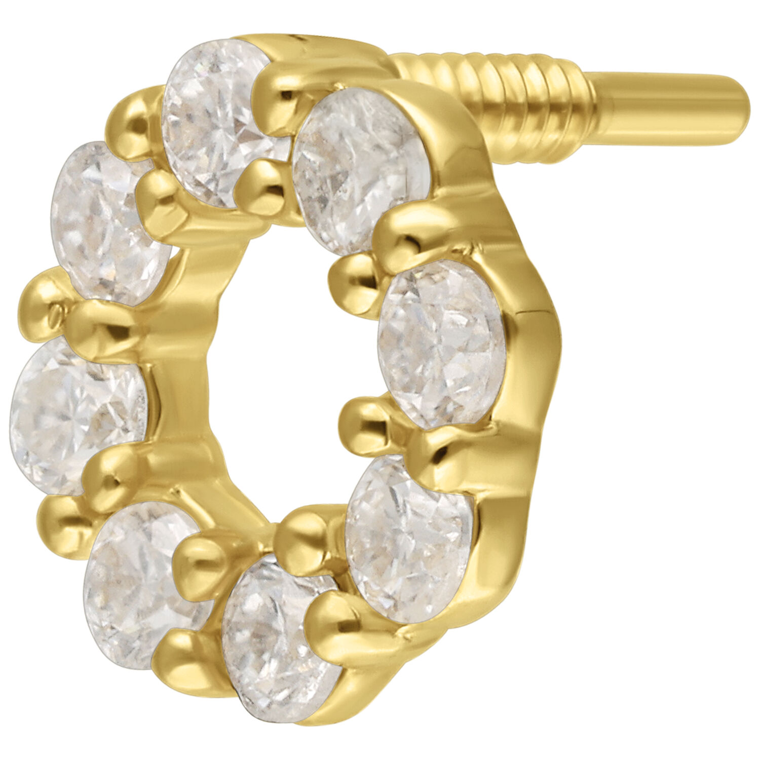 Il terminale Circle Perfect Fit in oro 14K con Moissanite rappresenta equilibrio, precisione ed eleganza lussuosa. Una serie di scintillanti cristalli Moissanite forma un cerchio perfetto, catturando la luce in una simmetria impeccabile e restituendola con una brillantezza straordinaria.