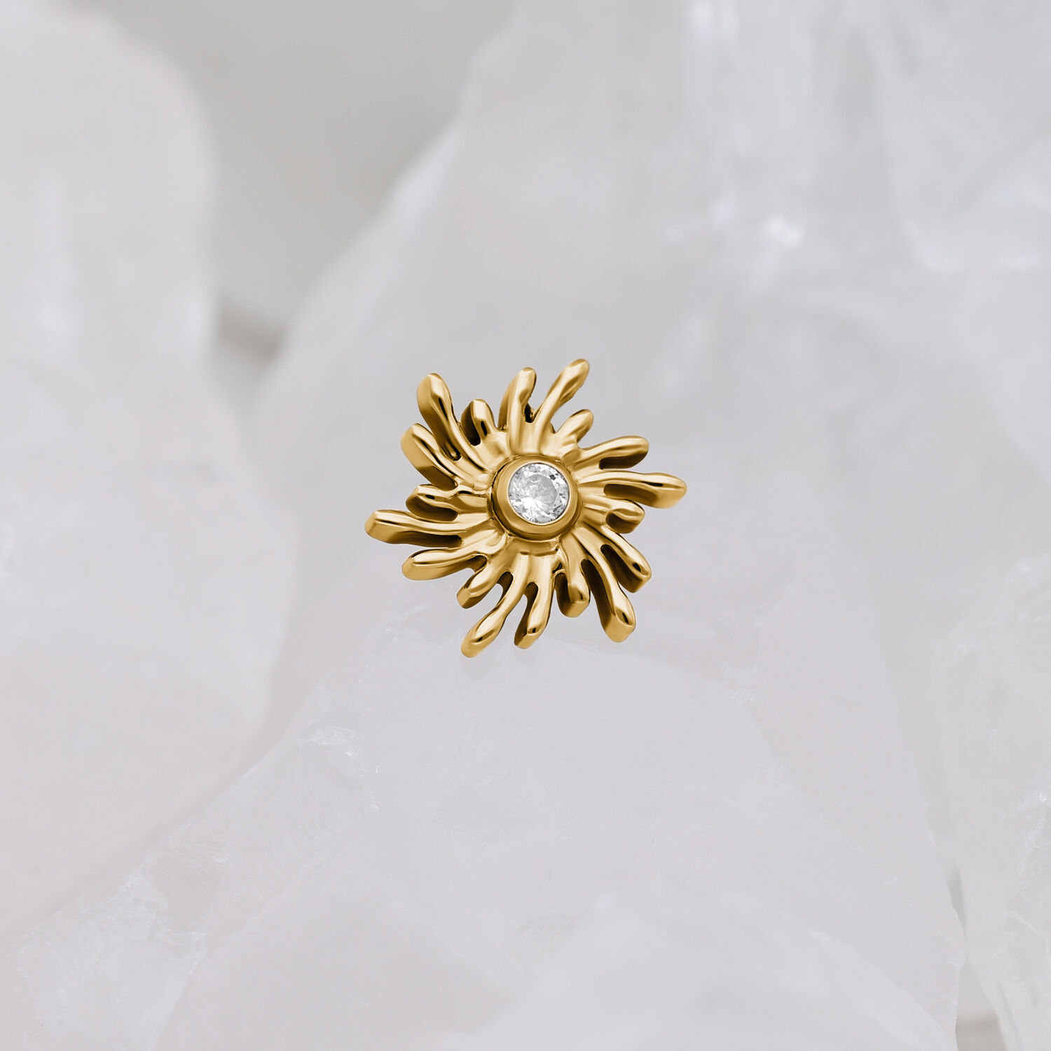 Il terminale Sunburst aggiunge una lucentezza raffinata e radiosa al tuo piercing. Il suo delicato design a raggi di sole si ispira al sole invernale che si riflette sui paesaggi innevati. Le linee sottili e i dettagli scintillanti creano un bagliore caldo ed elegante che valorizza il tuo look per tutta la stagione e oltre.