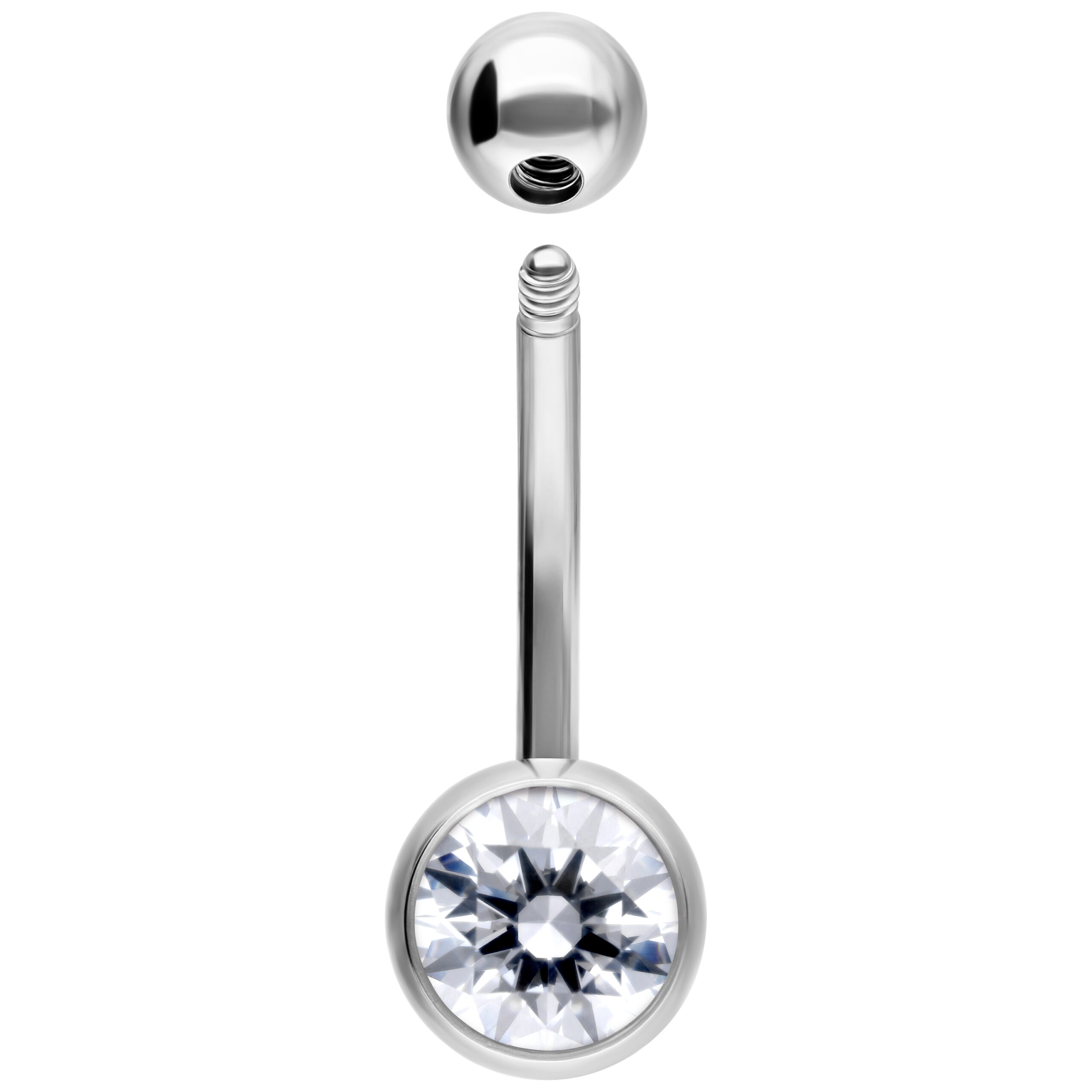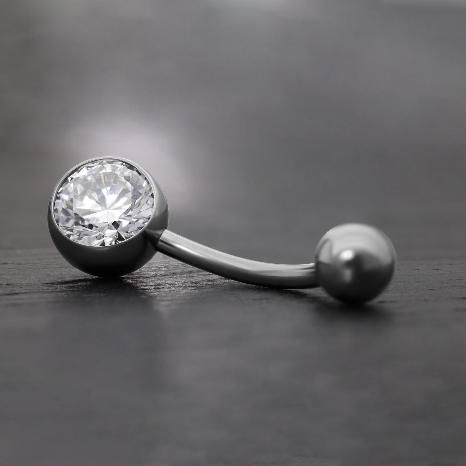 Il BYCG Jeweled Navel Bananabell con barra di 1,6 mm di spessore è disponibile in lunghezze di 10,0 e 12,0 mm, inclusa una pallina grande (8,0 mm) e una pallina piccola (5,0 mm). La sfera più grande è incastonata con un prezioso cristallo.