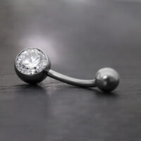 Bananabell piercing consistente in una barretta curva con due sfere o terminali di bloccaggio alle estremità, principalmente utilizzato per il buco dell’ombelico. Il bananabell viene anche chiamato banana piercing, bananina, barra curva, barbell curvo o semplicemente piercing all’ombelico.