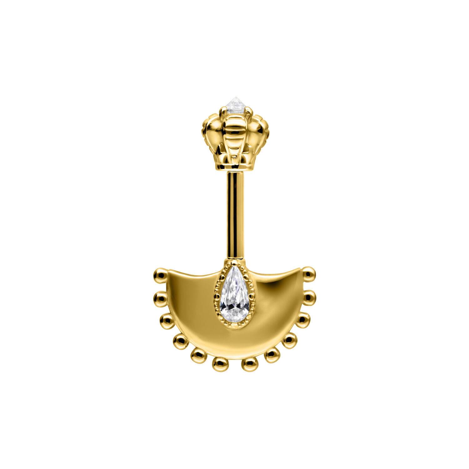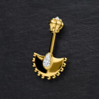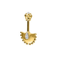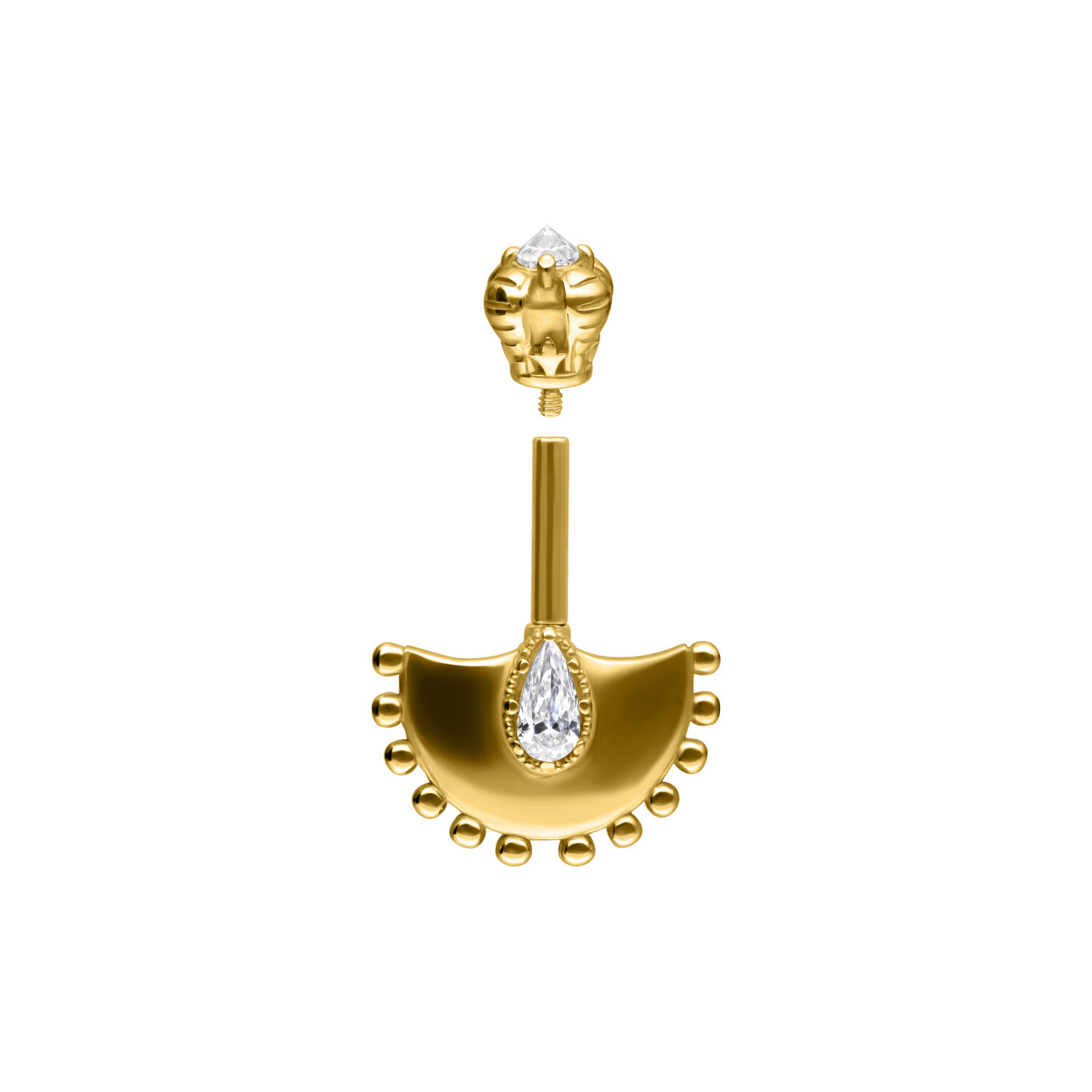 Un gioiello unico nel suo genere, pensato per chi ama i dettagli ricercati. Questo piercing per vertical helix colpisce per il suo design moderno e raffinato: al centro, un brillante zircone a goccia incastonato in un elemento semicircolare, decorato lungo il bordo da piccole sfere disposte in modo simmetrico. Il top con filettatura interna completa il look con eleganza e armonia.