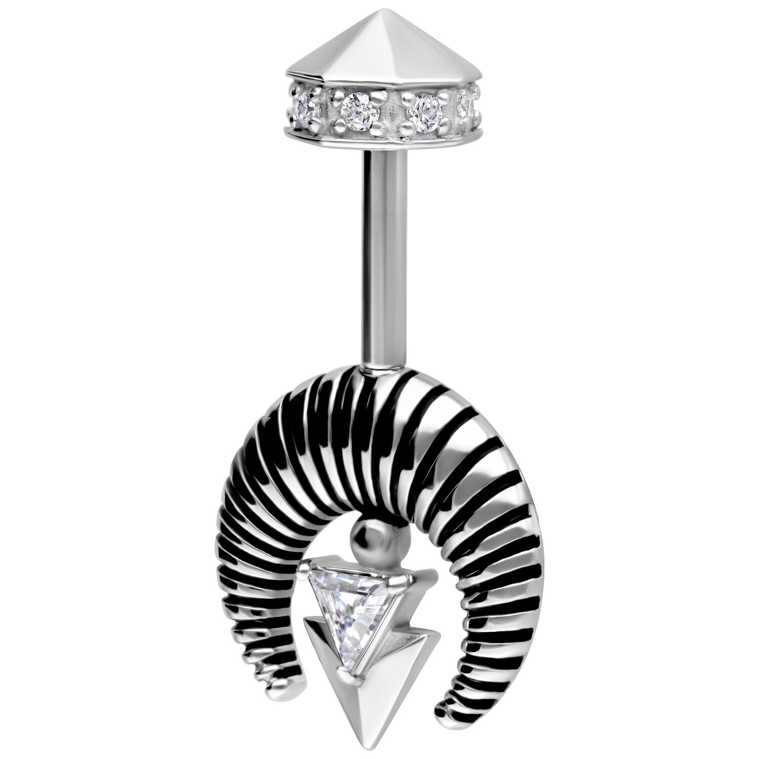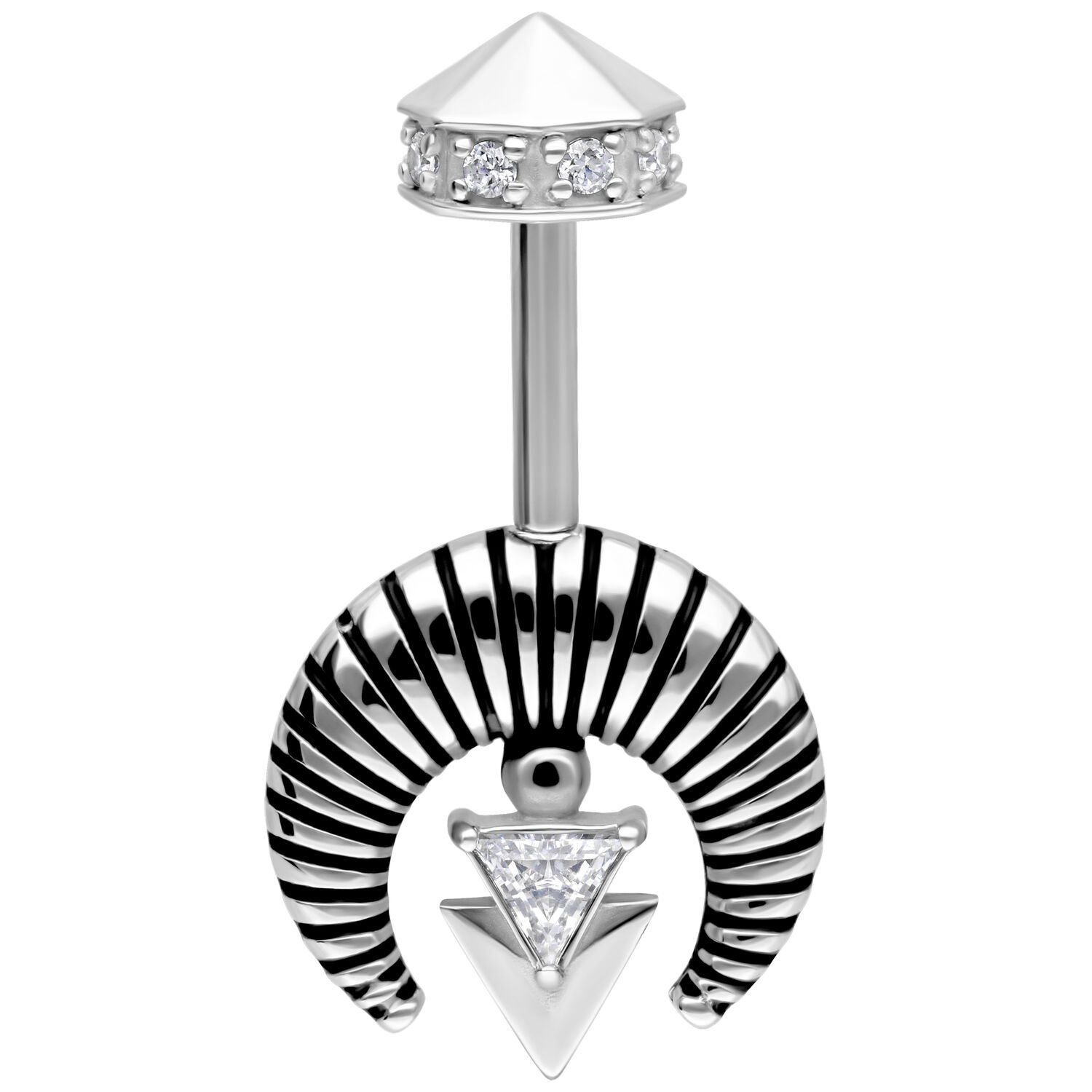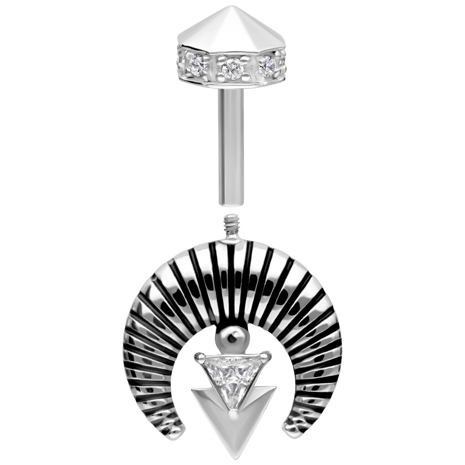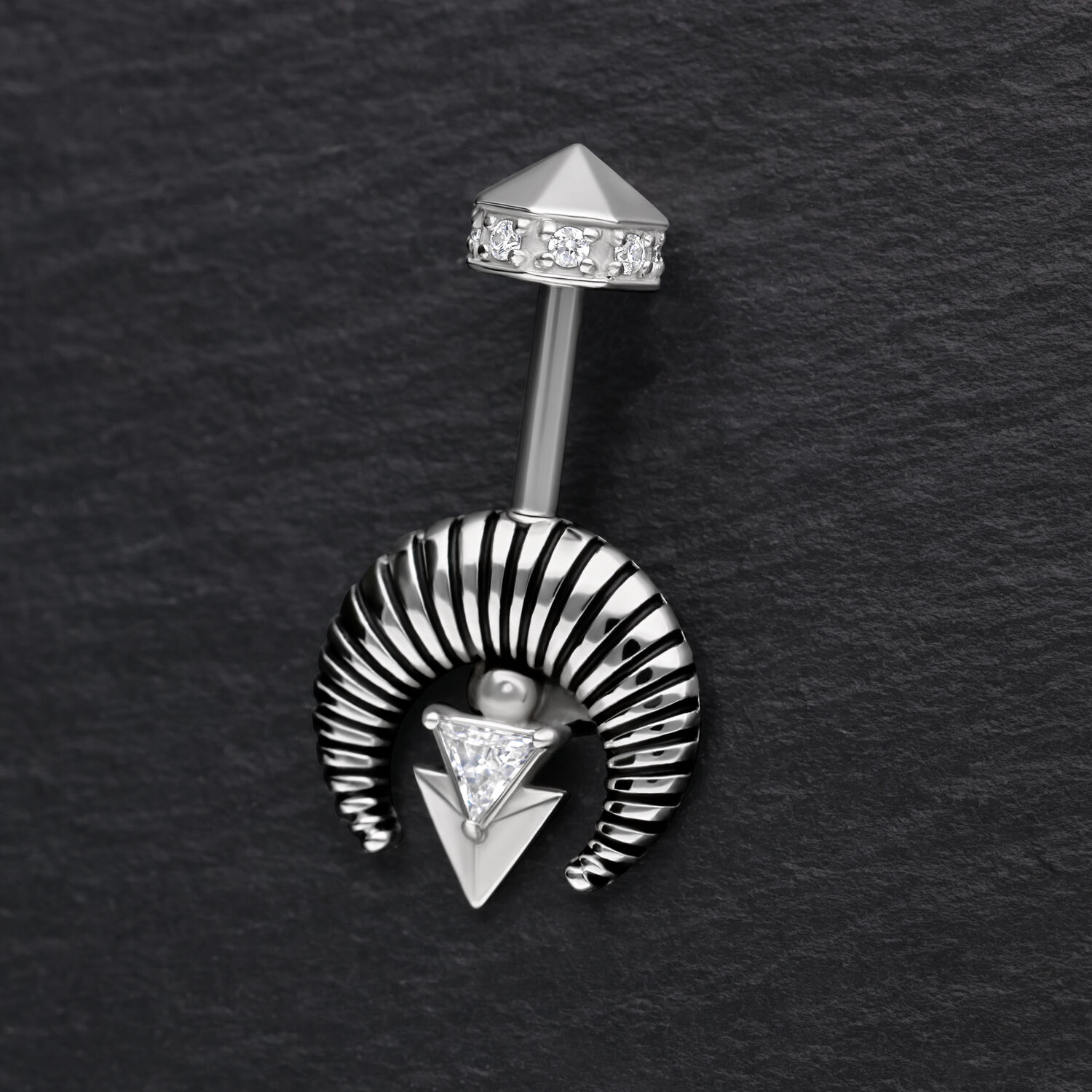 Un gioiello fuori dal comune, pensato per chi ama le linee decise e il design architettonico. Al centro della scena un brillante zircone triangolare, incorniciato da un elemento semicircolare rigato dal carattere forte. Il dettaglio geometrico a forma di freccia rovesciata aggiunge un tocco moderno e sofisticato.