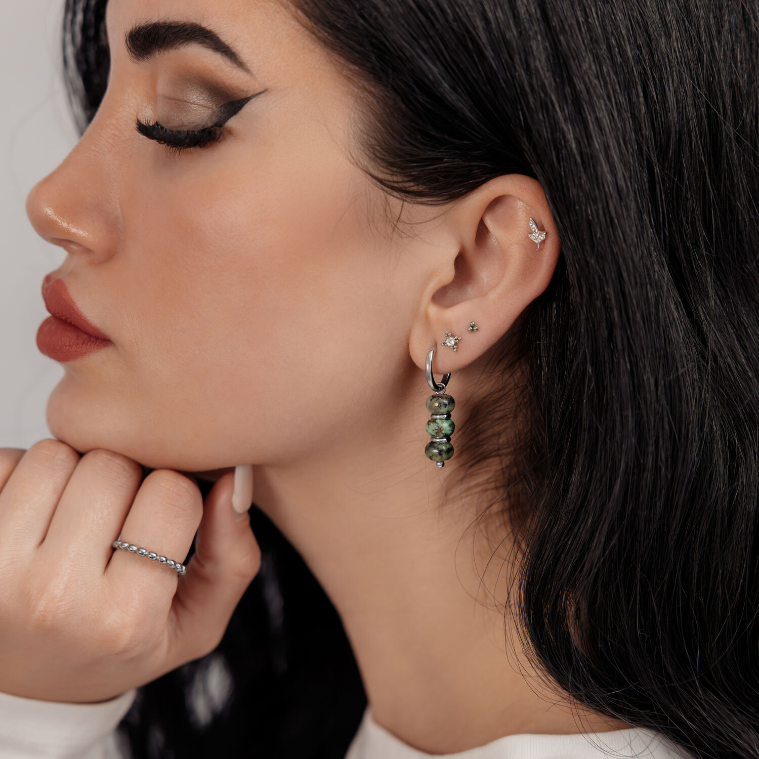 I Mini Hoops Bubble con turchese africano presentano una combinazione equilibrata di forme metalliche pulite ed elementi in pietra di ispirazione naturale. Numerose perline arrotondate in turchese africano sono disposte verticalmente, creando un look calmo e organico con un movimento sottile.