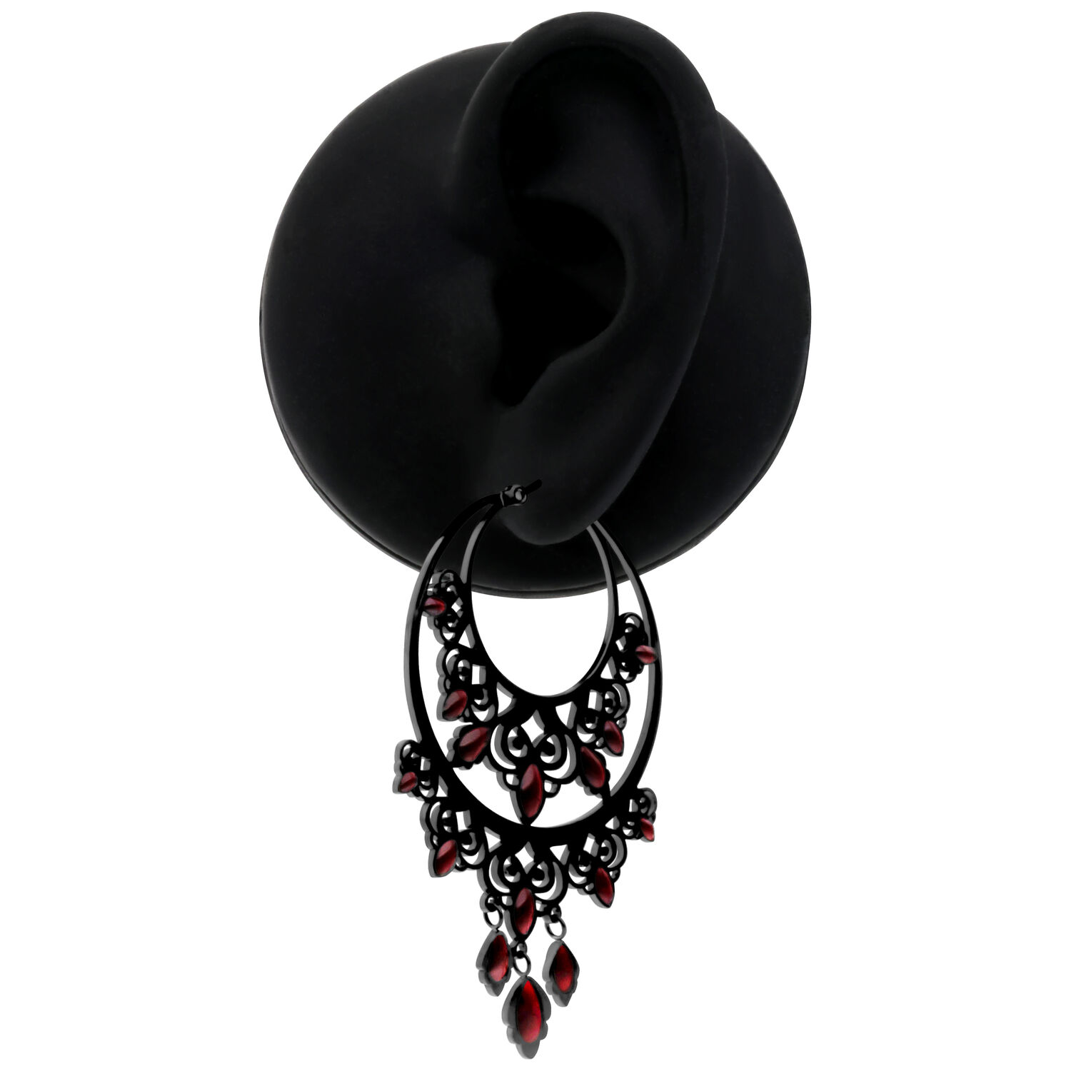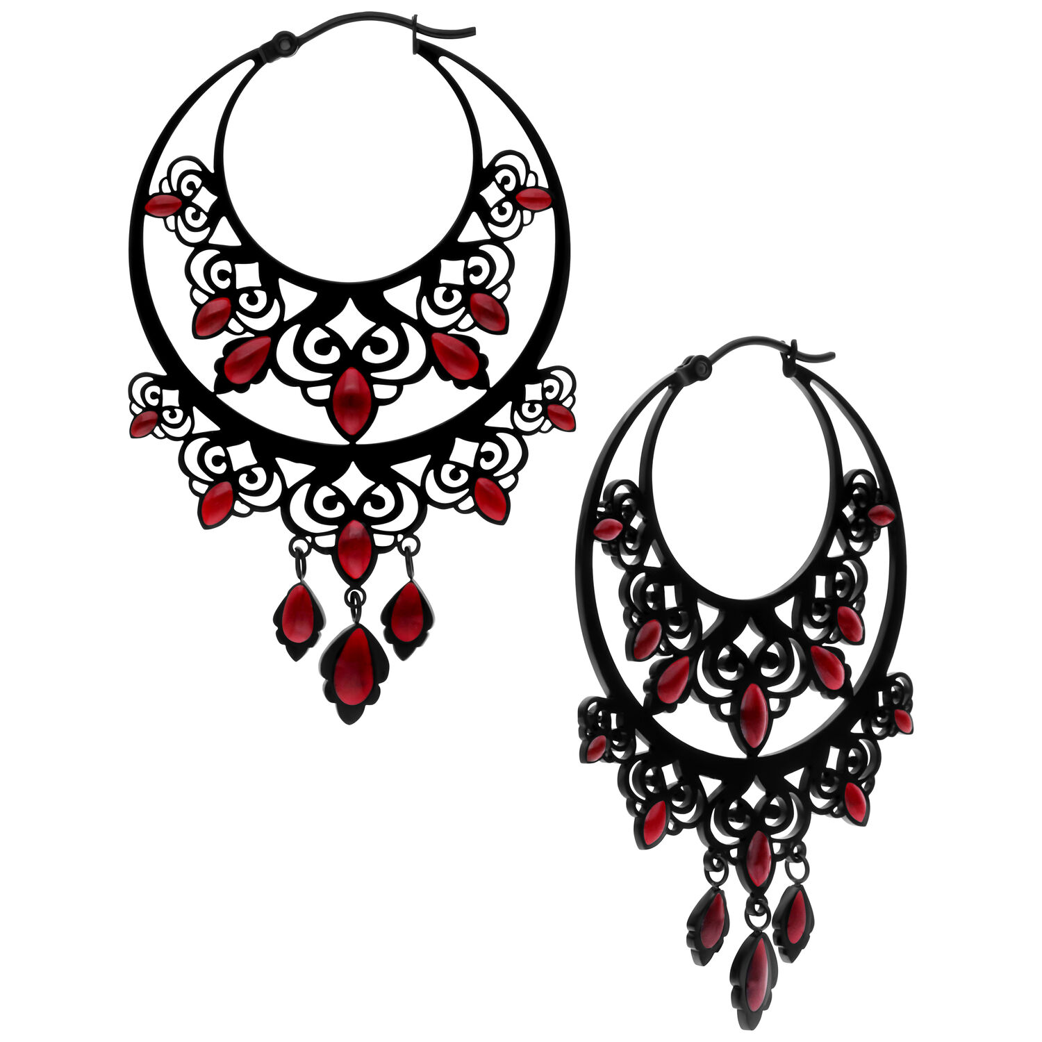 Orecchini realizzati in acciaio con colorazione nera. Sono caratterizzati dalla forma di lampadario con ornamenti e pendagli colorati di rosso.
