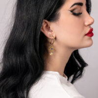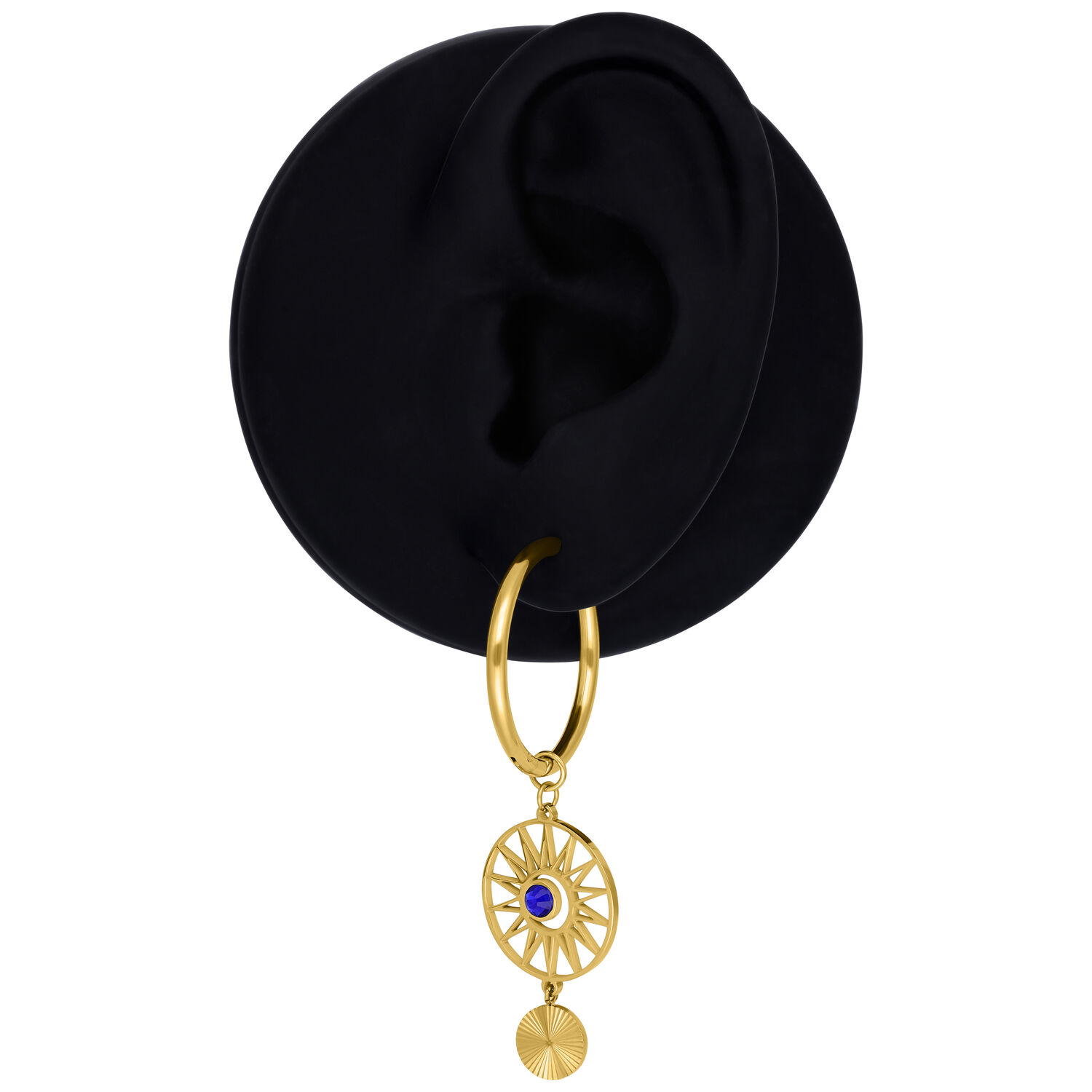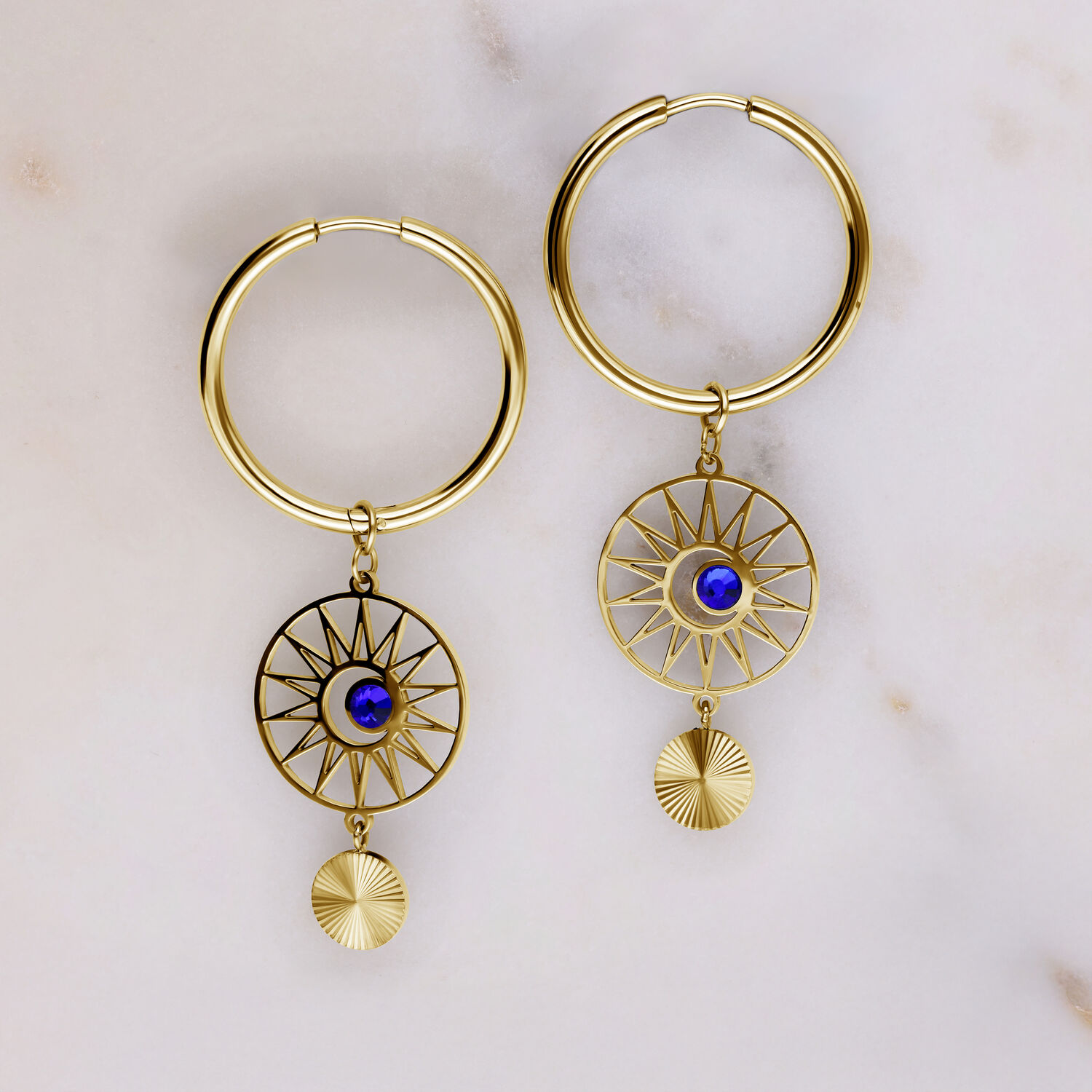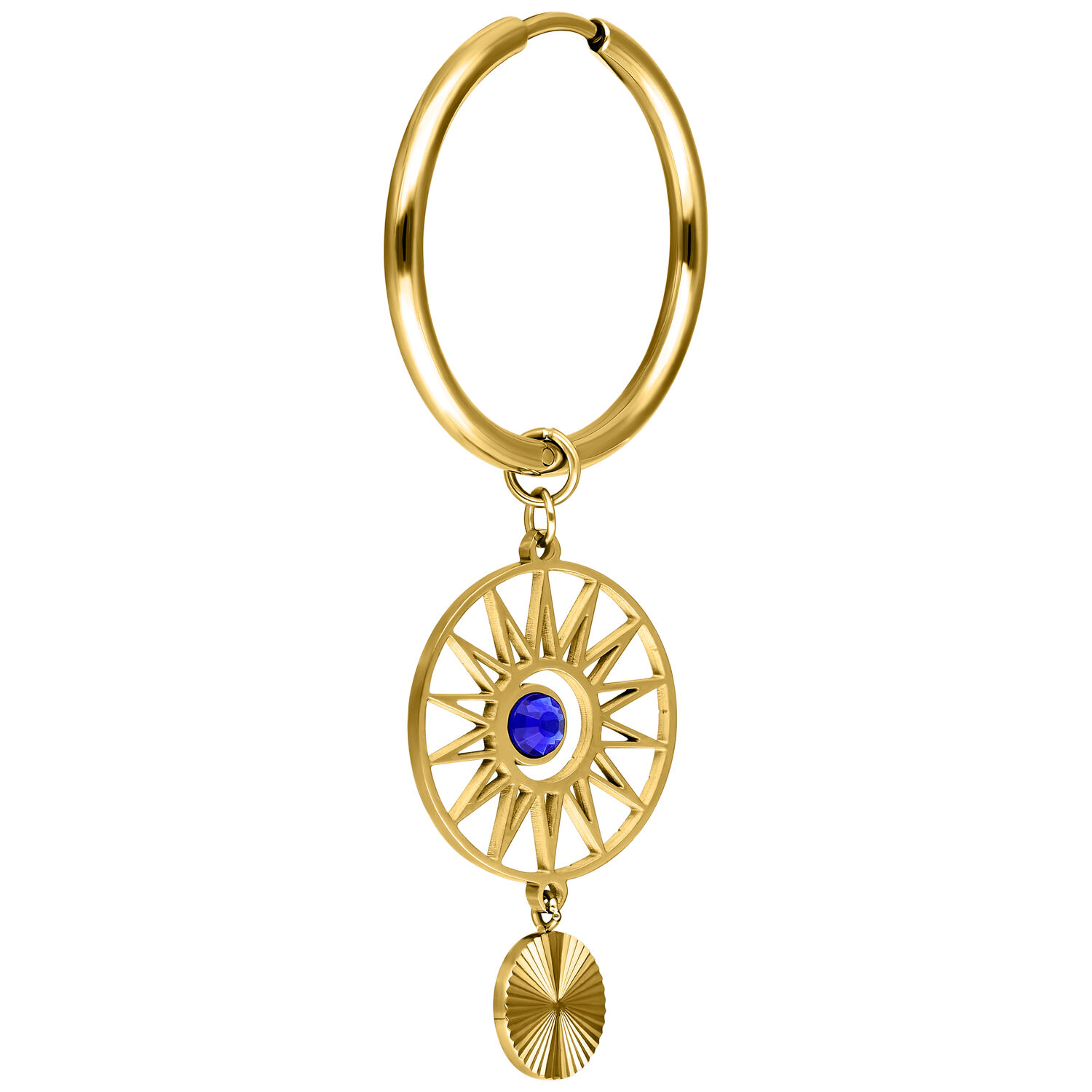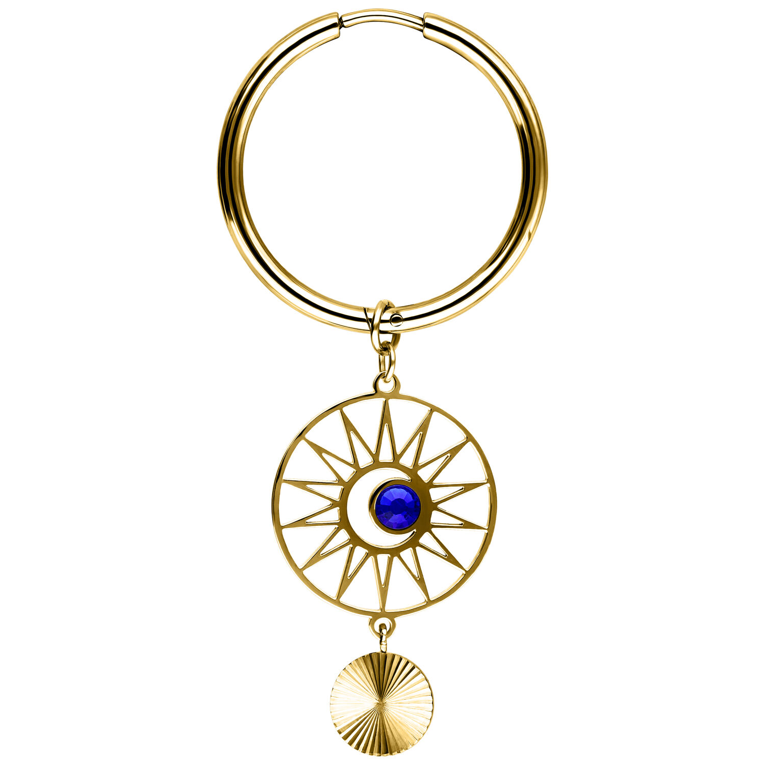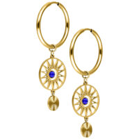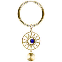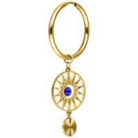 Gli orecchini Hoops Celestial Orbit presentano un design audace e di ispirazione cosmica. Un pendente rotondo con una struttura radiosa simile a un raggio di sole incornicia uno zircone blu al centro. Un ulteriore elemento pendente finemente lavorato aggiunge movimento e profondità al look complessivo.