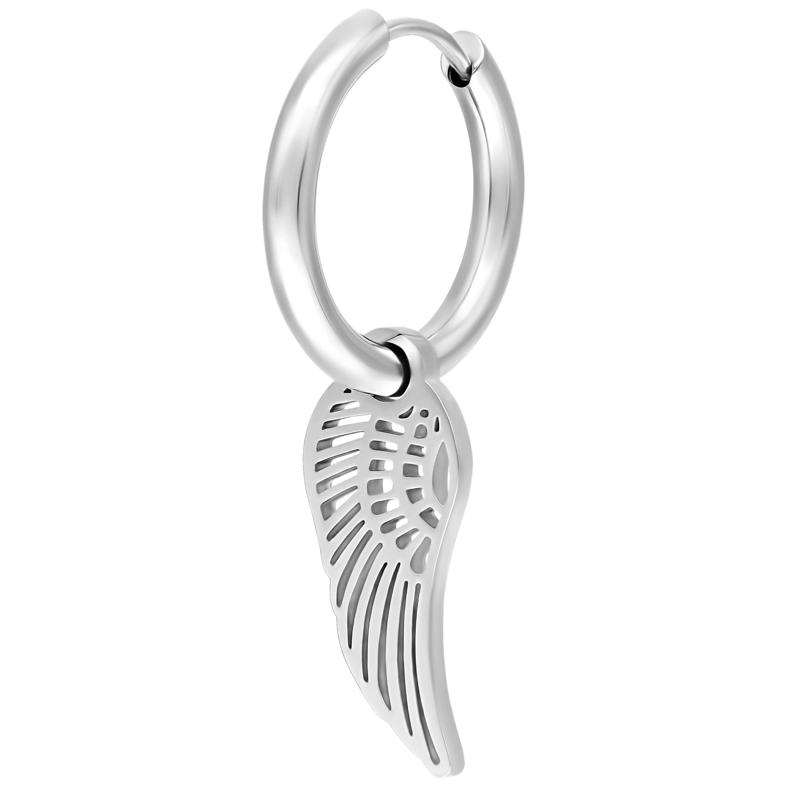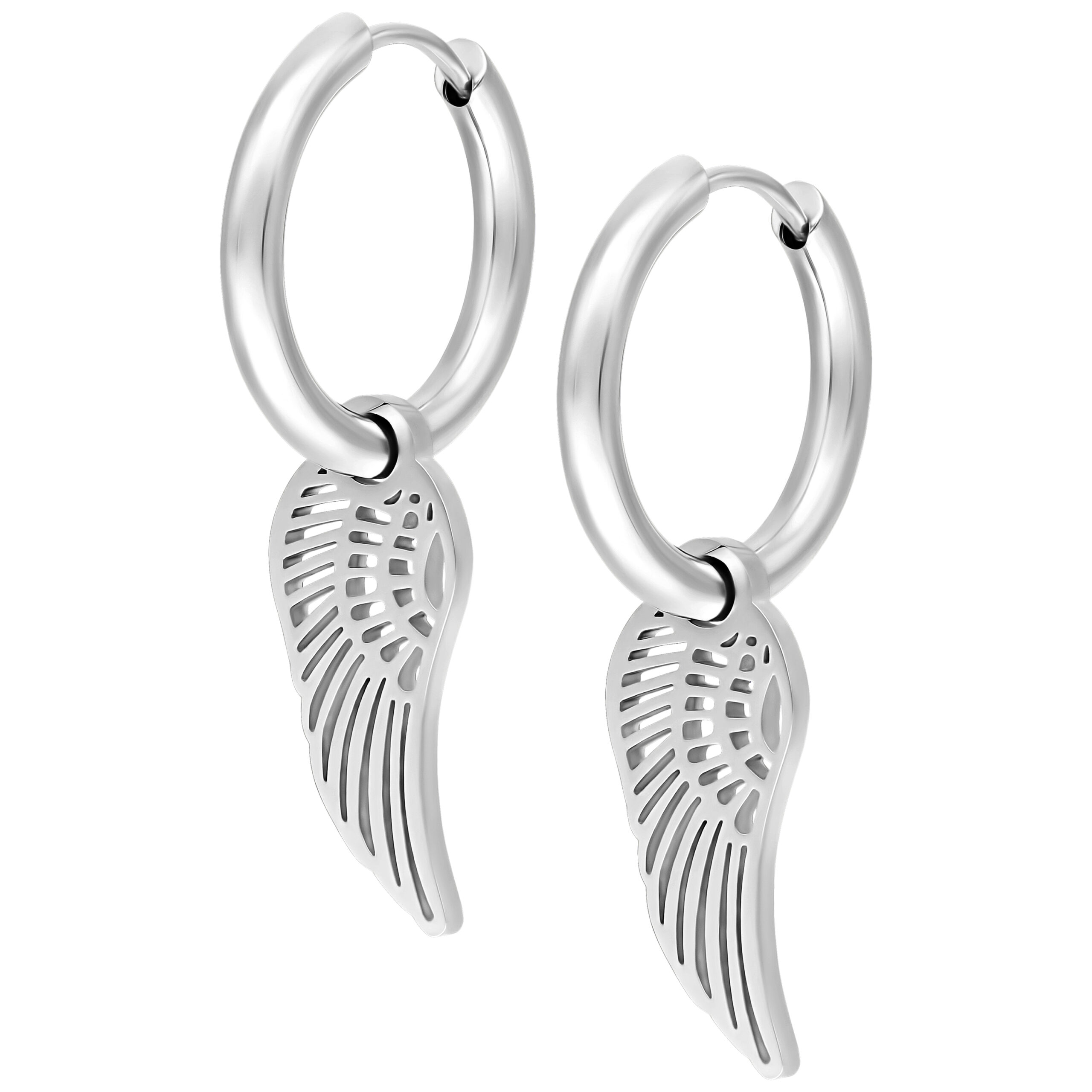 Orecchini realizzati in acciaio con colorazione naturale. Il gioiello presenta un pendente a forma di ala d’angelo su ciascun orecchino.