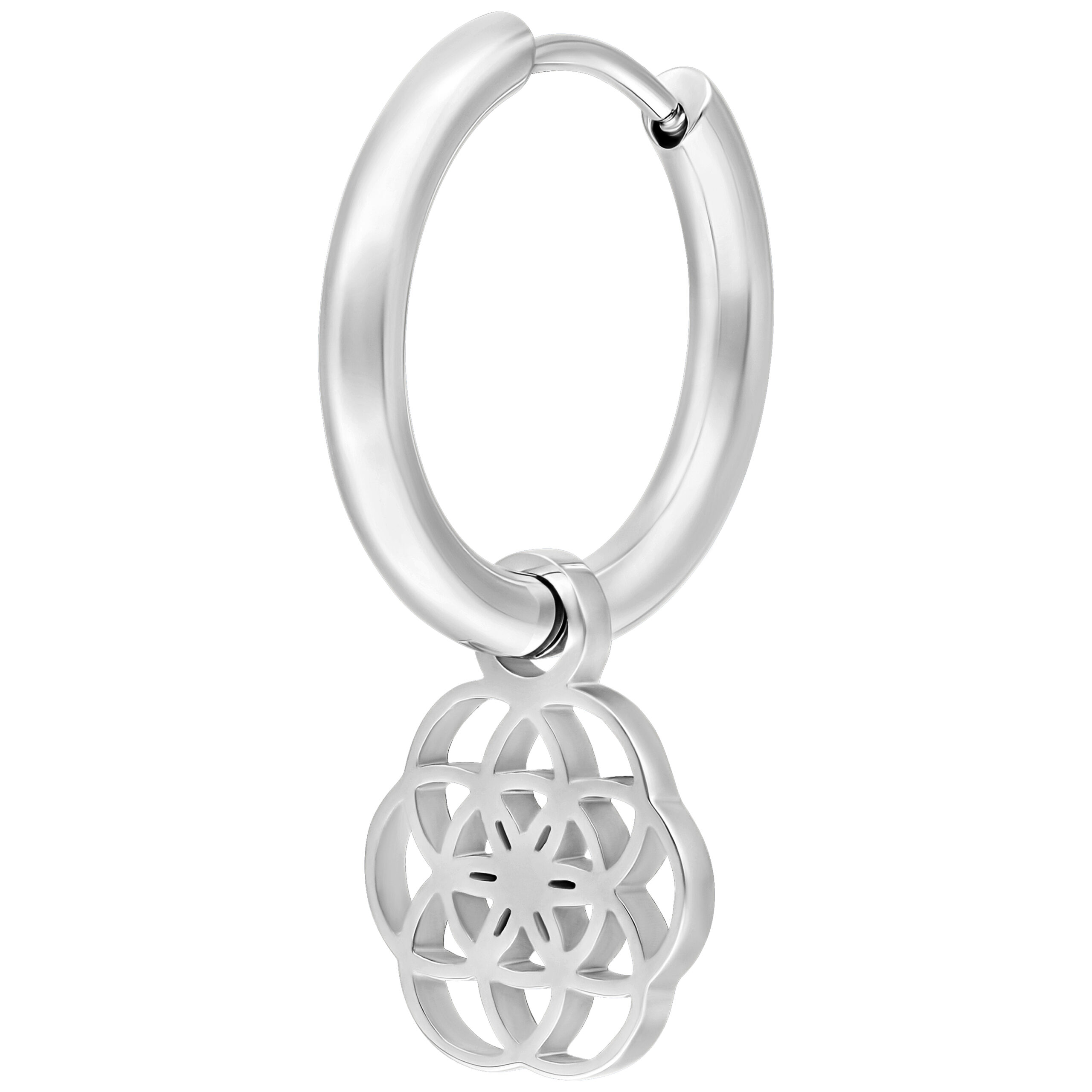 Orecchini realizzati in acciaio con colorazione naturale. Il gioiello presenta un pendente a forma di fiore della vita su ciascun orecchino. Indossali come classici orecchini, oppure aggiungili come accessorio ad un tunnel!