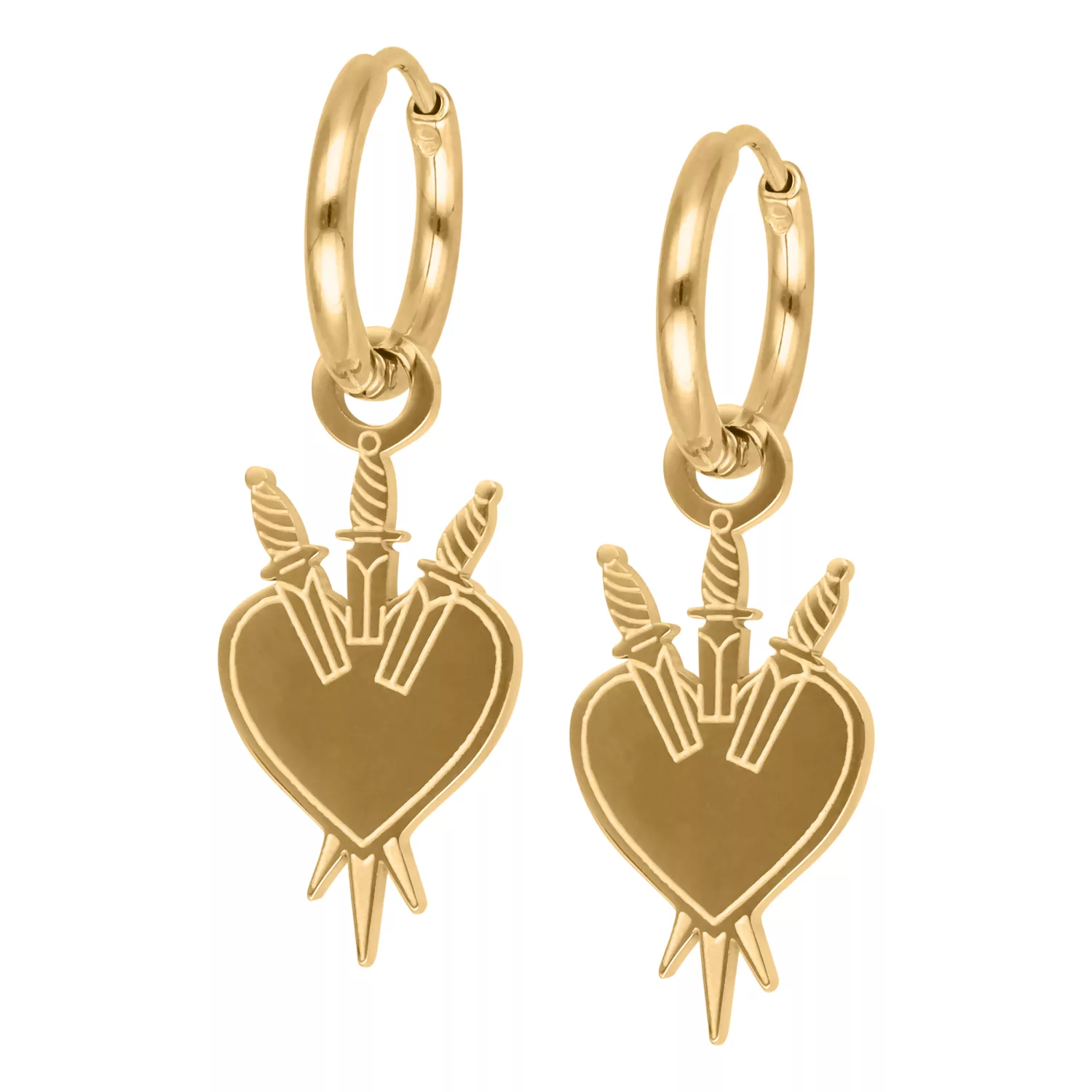 Orecchini realizzati in acciaio con colorazione dorata. Il gioiello presenta un pendente a forma di cuore con tre spade che lo trafiggono. Indossali come classici orecchini, oppure aggiungili come accessorio ad un tunnel!