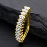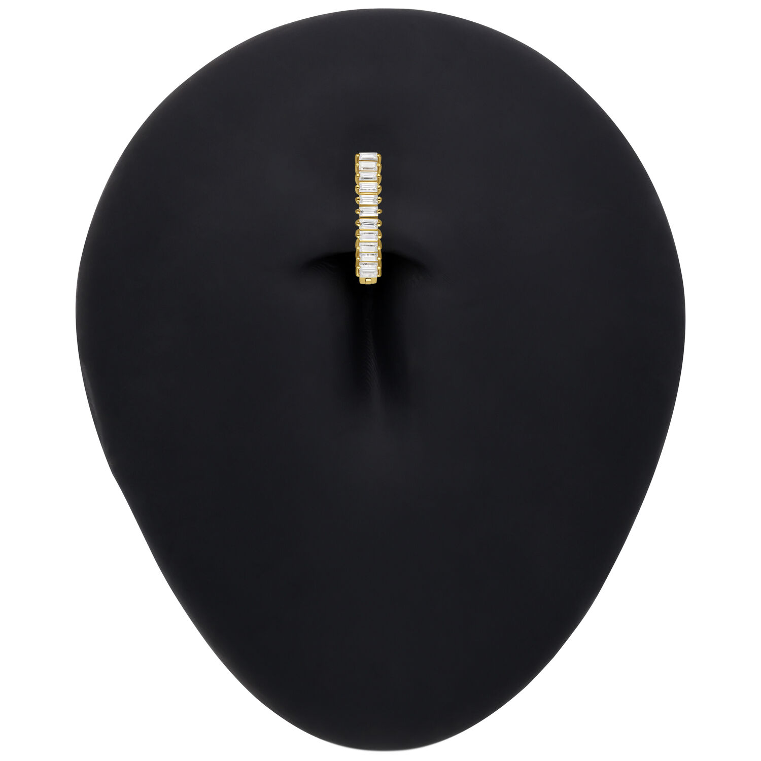Il Belly Arch Clicker in oro 18K con Moissanite baguette è la scelta ideale per chi ama i piercing in vero oro, caratterizzati da un’eleganza luminosa e da un design intramontabile.