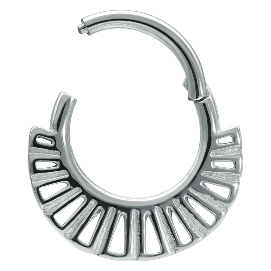 Anello da piercing con cerniera: l’Hinged Ring fa parte della selezione basica di qualsiasi piercer aggiornato alle richieste contemporanee. Fondamentalmente composto da due sezioni, da chiuso appare però come un pezzo unico, ricordando in tutto e per tutto un normale segment ring. La differenza è che il segmento apribile di questo anello non è separabile, ma fissato al cerchio da una comoda chiusura a cerniera.