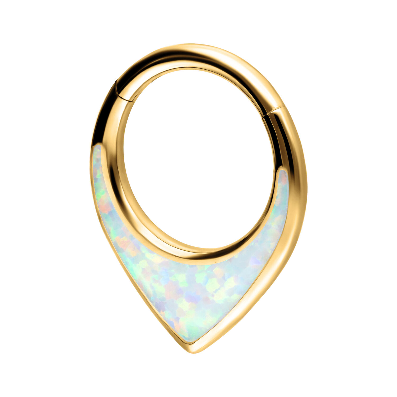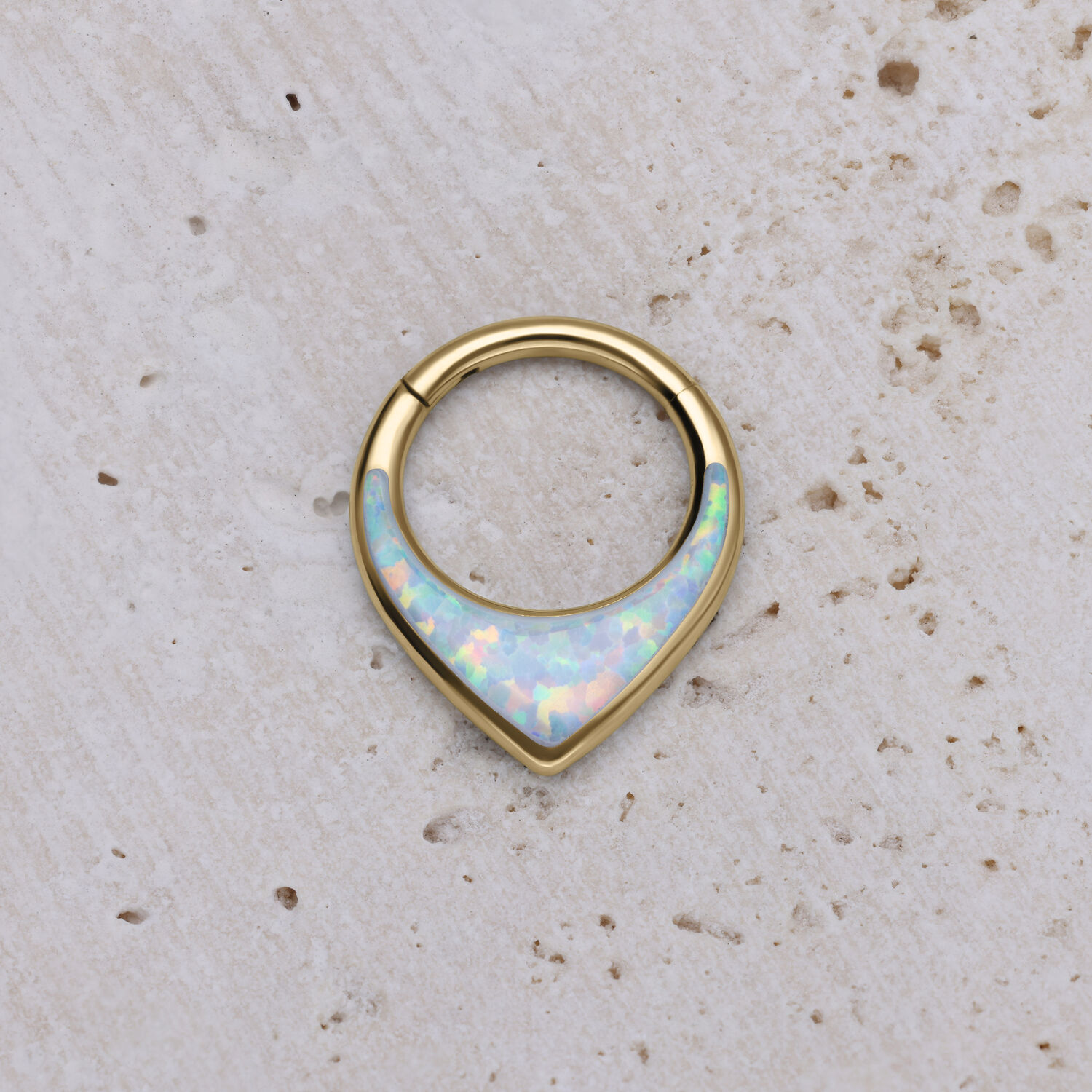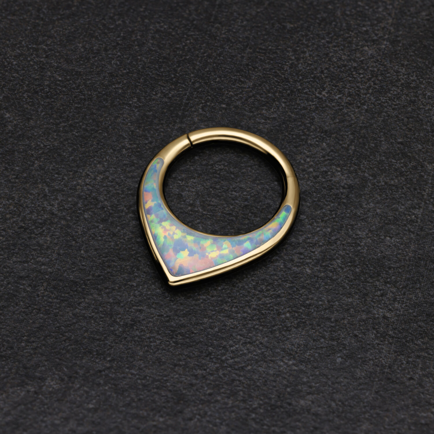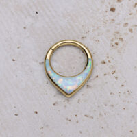 Il Chunky Opal Clicker con cerniera è facile da inserire e può essere indossato non solo come gioiello per il setto, ma anche nell’orecchio o nel frenulo labiale (smile). Il piercing è realizzato in titanio di alta qualità e presenta una splendida pietra opale sintetica. Le pietre opali sono davvero speciali: ogni pezzo è creato in modo unico e sembra un’edizione limitata. A seconda dell’angolazione e dell’illuminazione, i nostri opali riflettono lampi di colore vibranti o pastello. Non perderti questo spettacolo di colori: ottieni l’intero spettro sotto forma di gioielli per piercing!