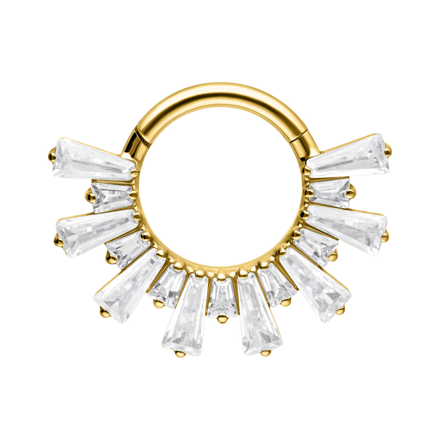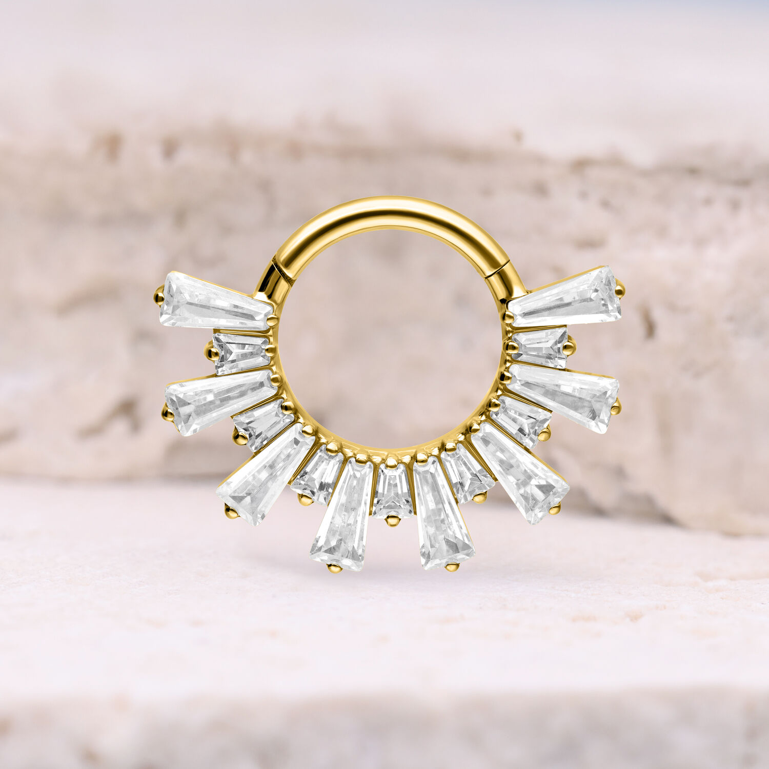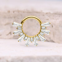 Il clicker Crystal Sunray per Septum & Daith in titanio grado 23 combina materiali di alta qualità con un design lussuoso. Pietre di cristallo trasparenti e scintillanti sono disposte in un radioso motivo a raggi di sole, creando un look elegante e accattivante.