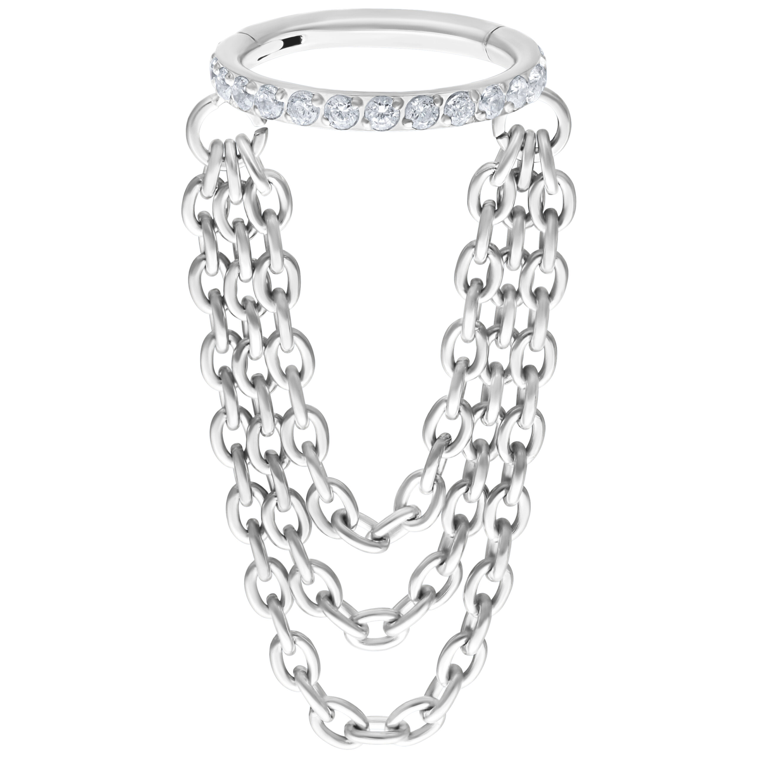 L’anello incernierato consente un facile inserimento e un comfort ottimale. Anche questo piercing è realizzato in titanio di alta qualità con rivestimento in PVD color oro bianco.