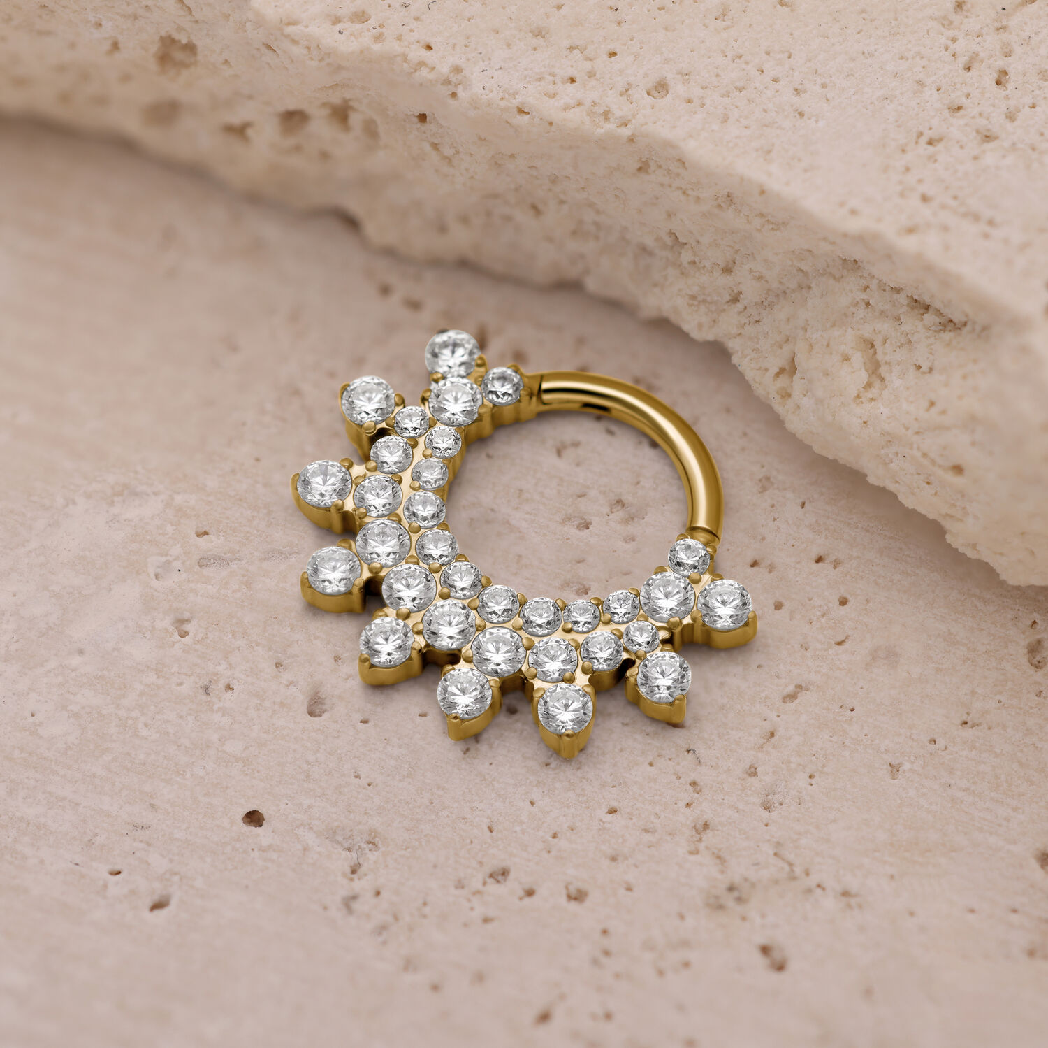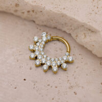 Il Divine Crystal Clicker realizzato in titanio grado 23 è un vero e proprio gioiello per chi ama i piercing audaci. Caratterizzato da una profusione di cristalli trasparenti e scintillanti, questo modello offre la massima brillantezza e un look lussuoso e accattivante. L’aspetto raffinato aggiunge un tocco di glamour espressivo a qualsiasi piercing.