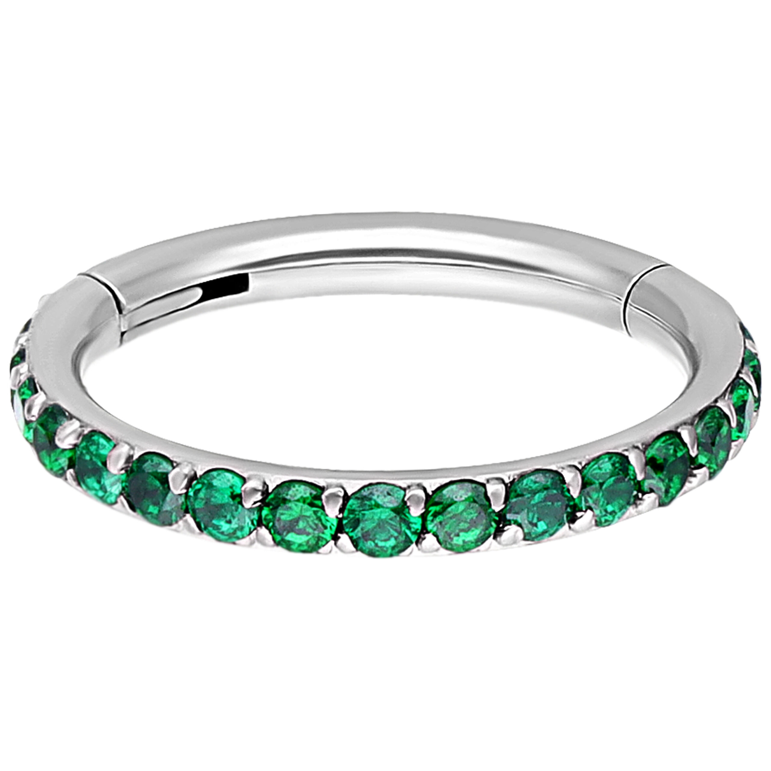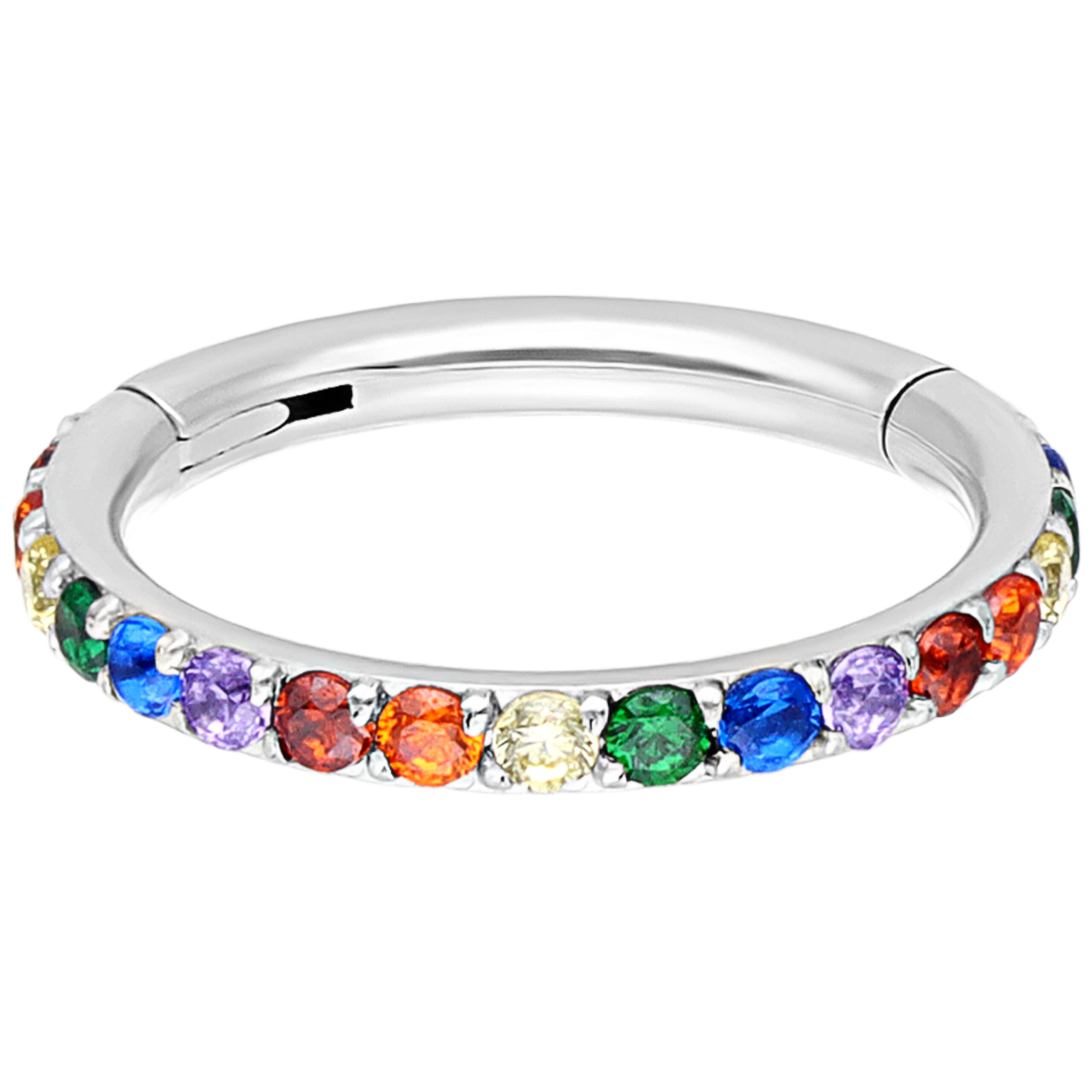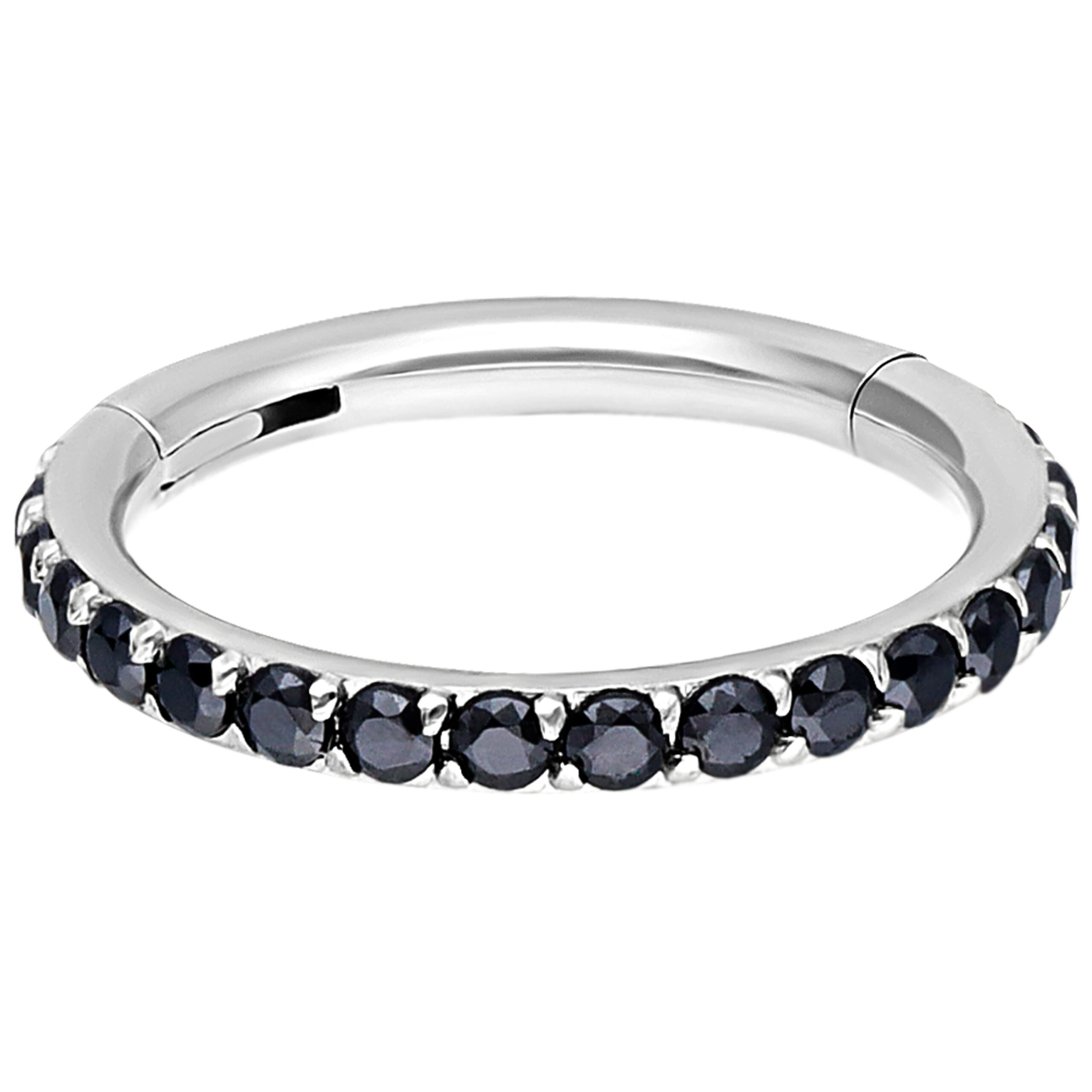 Questo particolare gioiello presenta diverse pietre brillanti chiare lungo la circonferenza esterna del piercing.