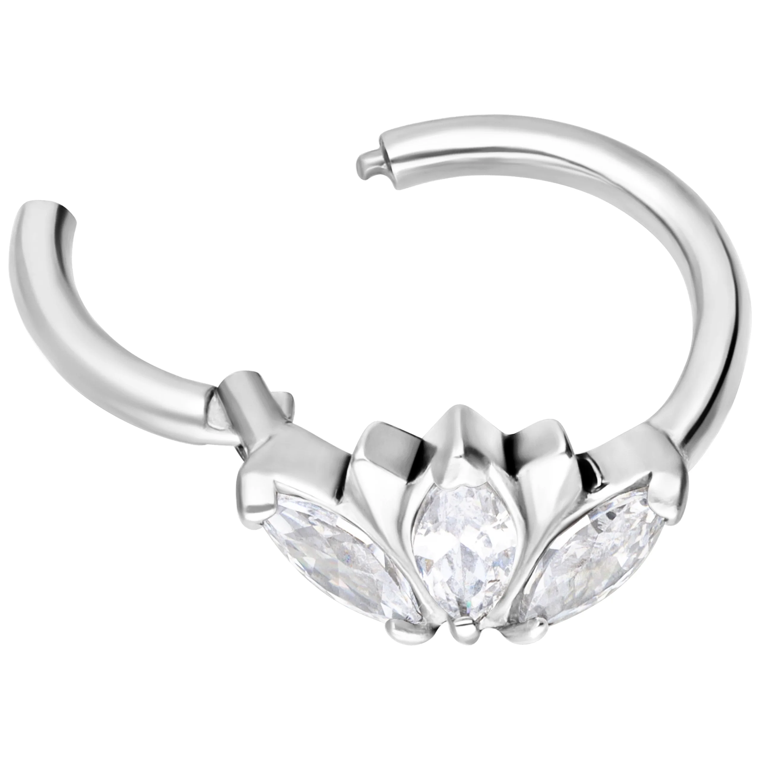Questo anello in acciaio di alta qualità si contraddistingue particolarmente per la serie di tre cristalli Zirconi che permettono al gioiello di brillare intensamente anche da una certa distanza. Perfetto per sfogare la propria creatività, può essere utilizzato praticamente per ogni piercing dell’orecchio, anche se rimane specialmente indicato per il piercing Helix. Grazie alla pratica ed innovativa chiusura a cerniera, è super-facile da applicare, togliere o cambiare in autonomia senza nessun tipo di aiuto o strumento.