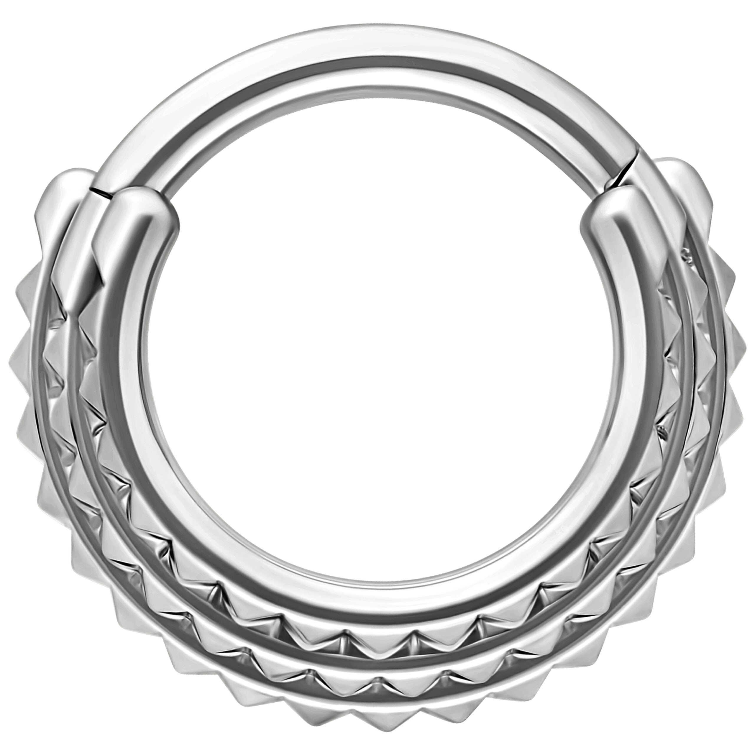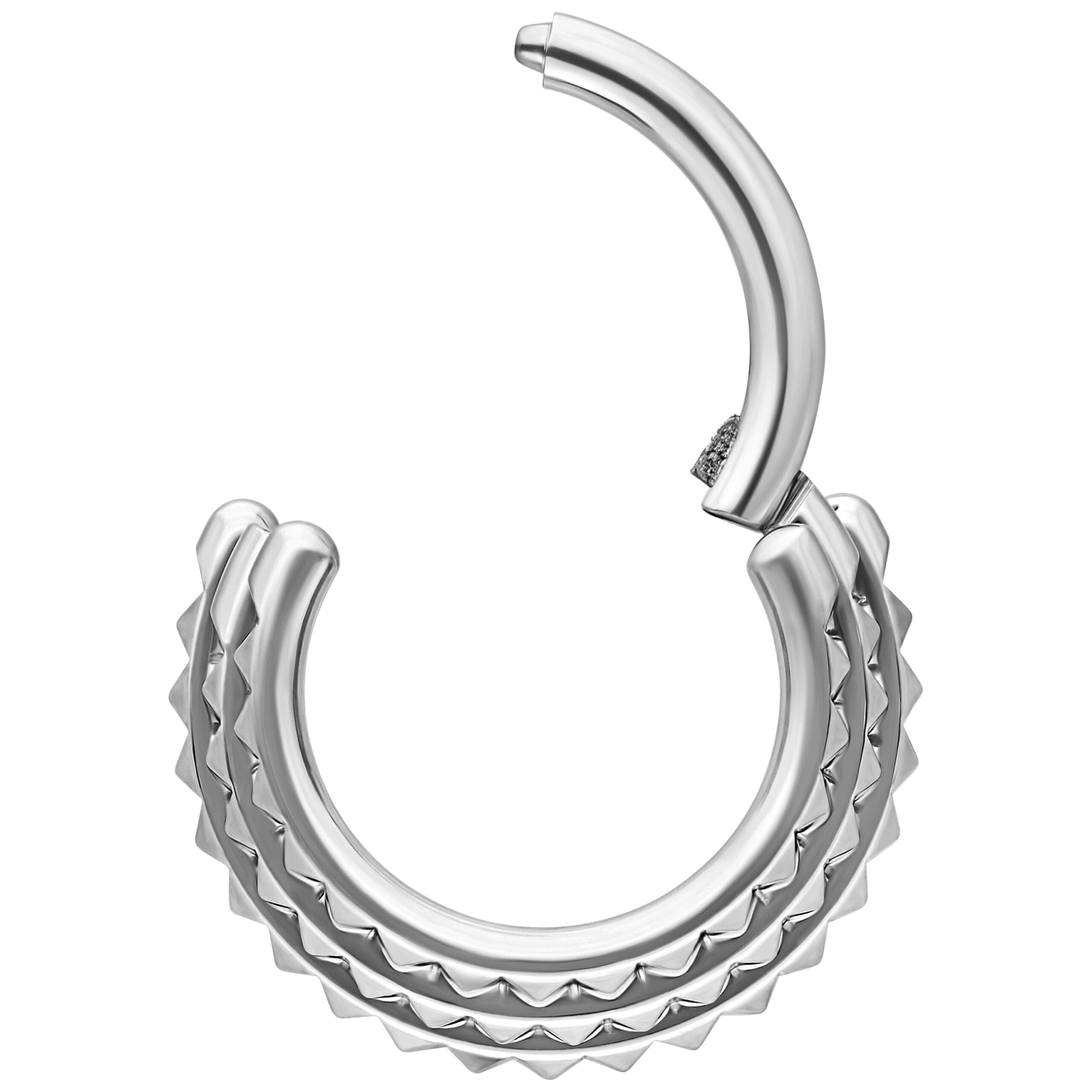 Il nostro Clicker con tre file di spikes è realizzato in acciaio inossidabile di alta qualità ed è ideale per il helix piercing, septum o daith. Il piercing è dotato di una barra a cerniera curva, che consente di inserire facilmente il gioiello anche in autonomia.