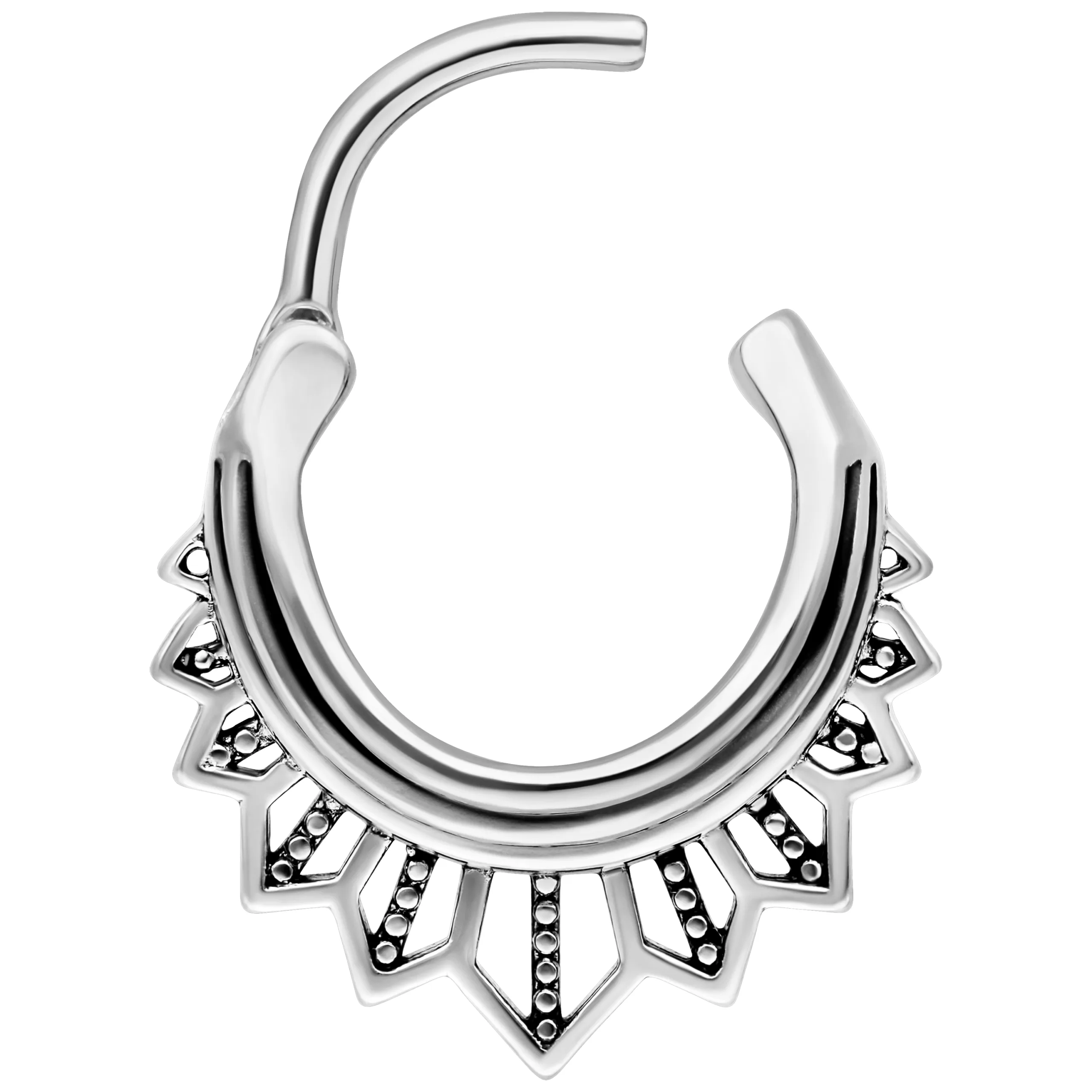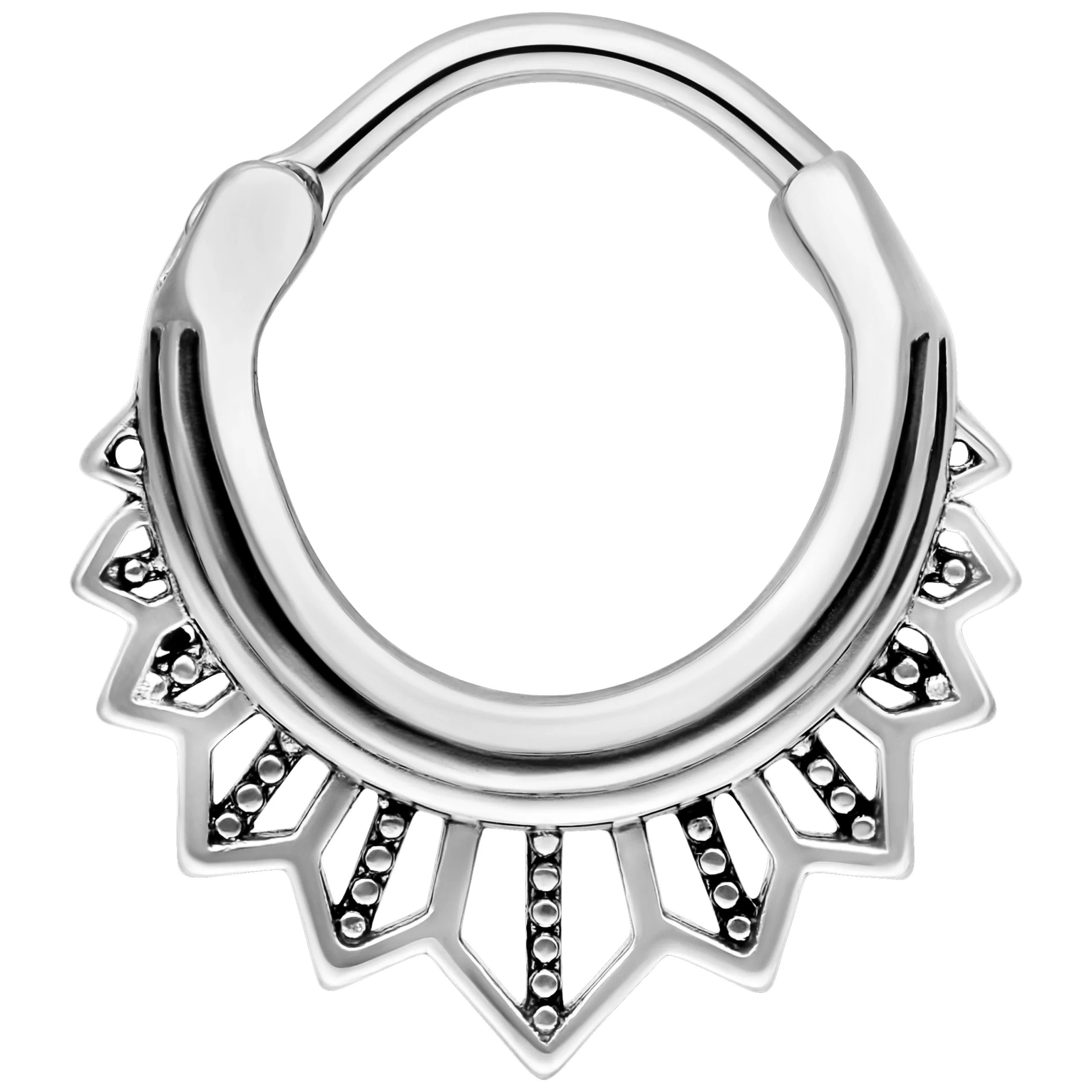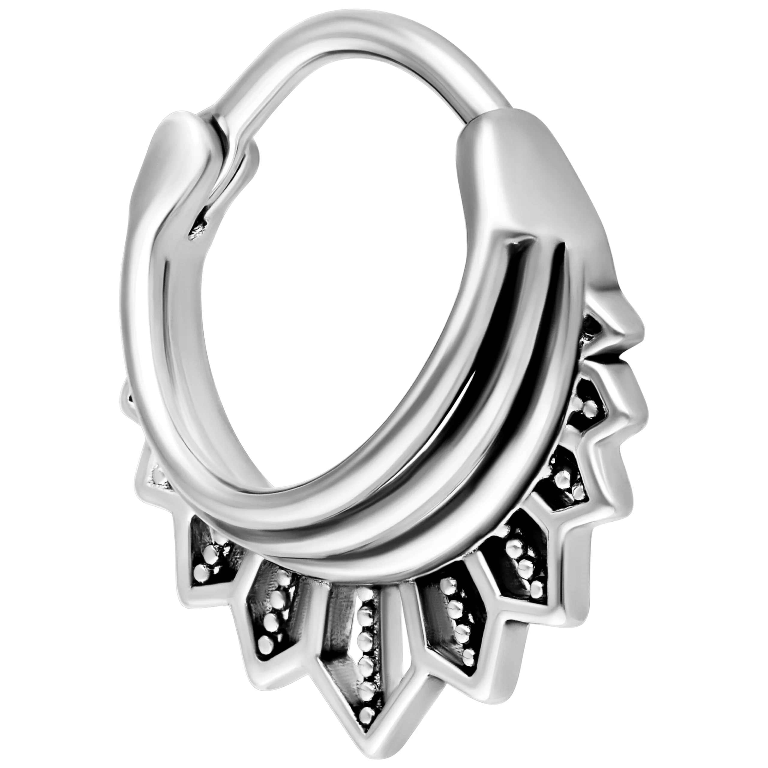 Anello da piercing con cerniera: l’Hinged Ring fa parte della selezione basica di qualsiasi piercer aggiornato alle richieste contemporanee. Fondamentalmente composto da due sezioni, da chiuso appare però come un pezzo unico, ricordando in tutto e per tutto un normale segment ring. La differenza è che il segmento apribile di questo anello non è separabile, ma fissato al cerchio da una comoda chiusura a cerniera.
