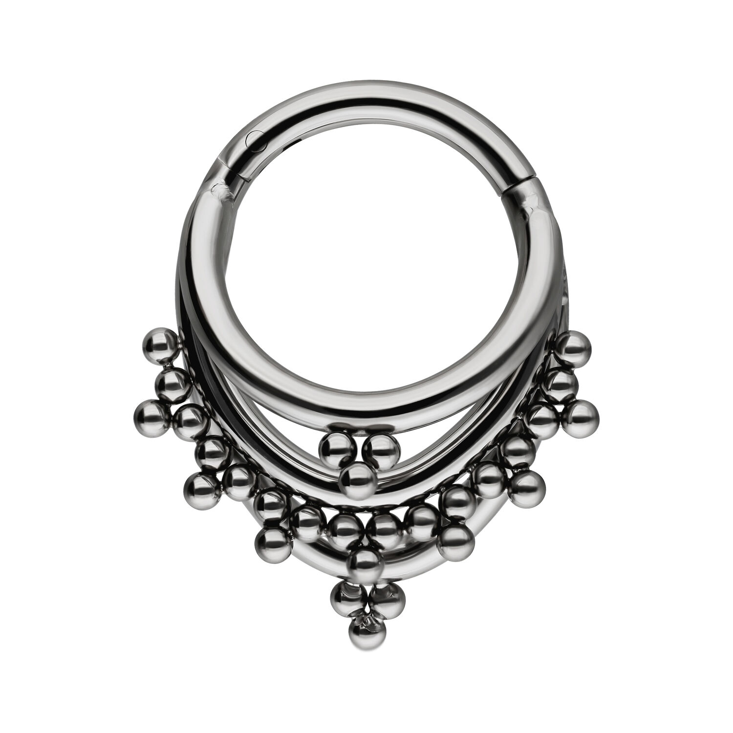 Sei alla ricerca di un piercing speciale che ti conquisti senza lustrini? Allora il nostro Triple Oriental Clicker è quello che fa per te! Da indossare tutti i giorni o nelle occasioni speciali, questo clicker in titanio aggiunge un tocco di bellezza orientale al tuo look. Concediti un accessorio che enfatizzi il tuo stile e ti faccia risplendere – senza alcun luccichio!