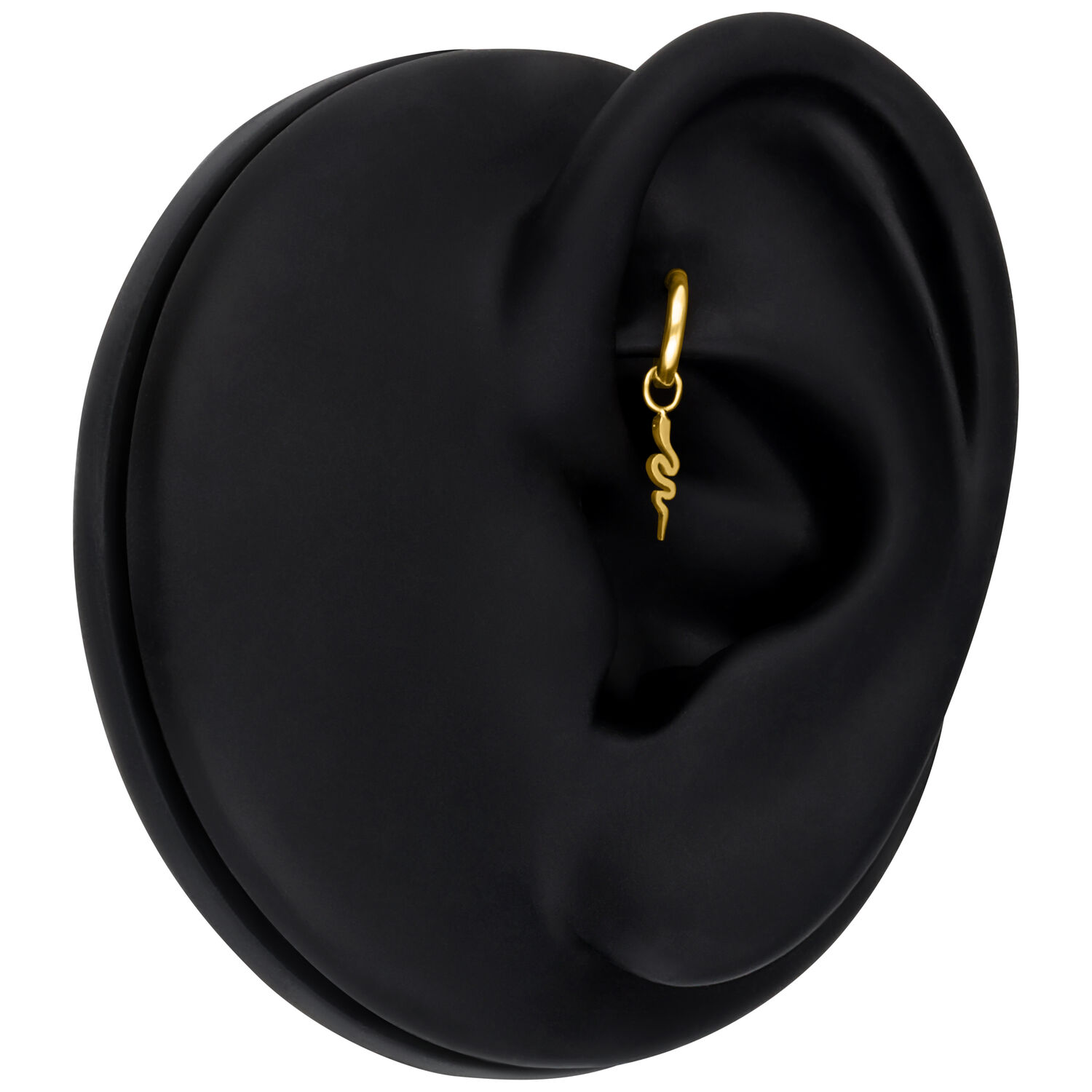 Con le sue dimensioni compatte e le proporzioni equilibrate, il pendente Snake è ideale per piercing al rook, helix, vertical helix o lobo. Indossato come accessorio discreto o come elemento distintivo, si abbina a un’ampia gamma di stili di piercing.